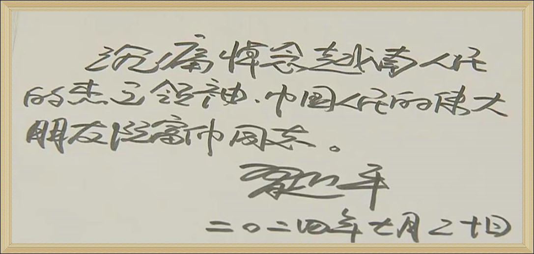習近平走到阮富仲遺像前駐足默哀,向遺像三鞠躬,在吊唁簿上留言并簽名。