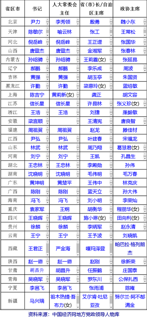 編者按:以下是全國31個省市自治區黨委、人大常委會、政府、政協四套班子主要領導名單,點擊姓名可查看簡歷。