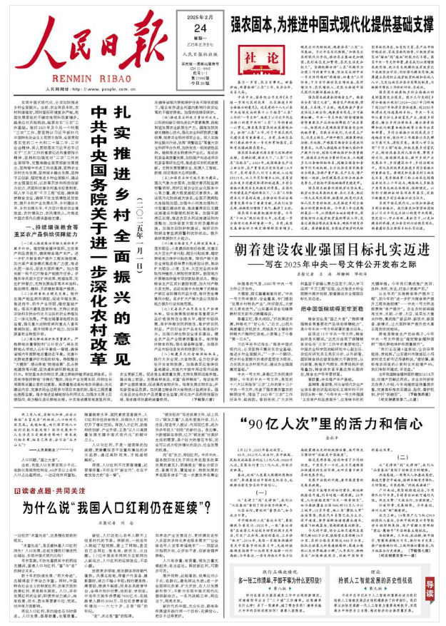 中共中央、國務院公開發布《關于進一步深化農村改革 扎實推進鄉村全面振興的意見》。這是黨的十八大以來中央連續發出的第十三個指導“三農”工作的“一號文件”,體現了以習近平同志為核心的黨中央對“三農”工作的重視一以貫之,強農惠農富農的政策持續加力。抓好“三農”工作,對于中國式現代化建設具有重要意義。當前,各地區各部門要抓好中央一號文件貫徹落實,采取有效措施強農固本。