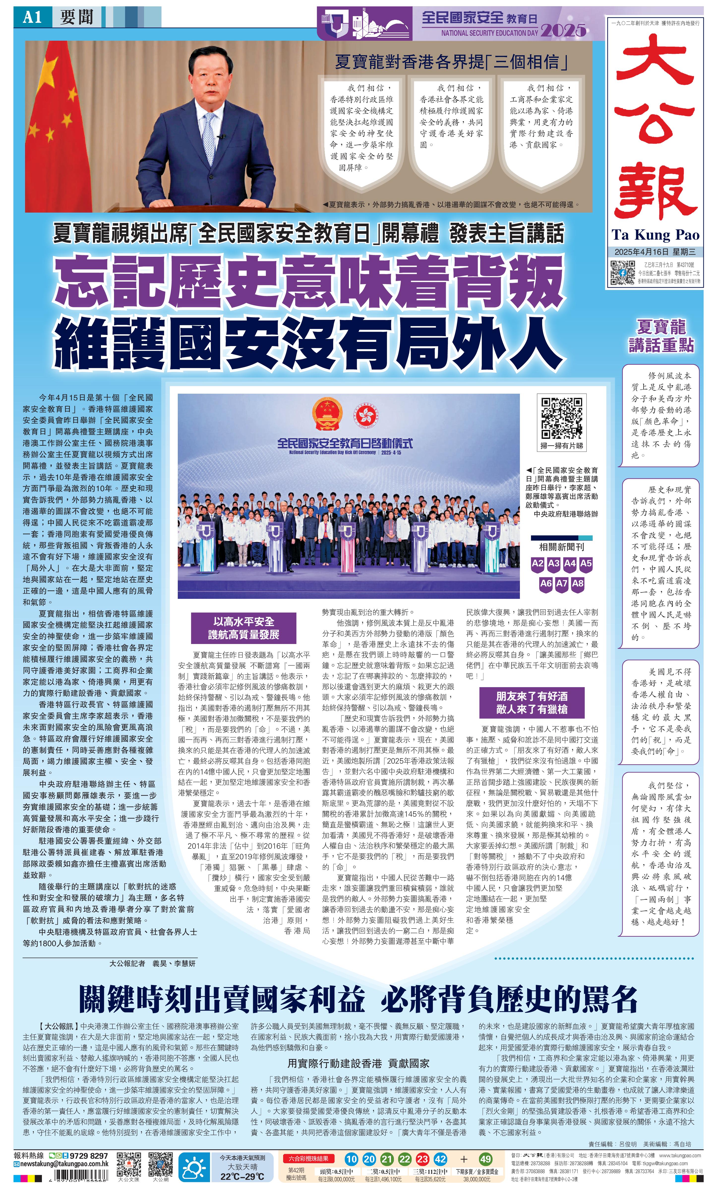 「我們相信,香港社會各界定能積極履行維護國家安全的義務,共同守護香港美好家園。」夏寶龍強調,維護國家安全,人人有責。每位香港居民都是國家安全的受益者和守護者,沒有「局外人」。大家要發揚愛國愛港優良傳統,認清反中亂港分子的反動本性,同破壞香港、詆毀香港、搞亂香港的言行進行堅決斗爭,各盡其責、各盡其能,共同把香港這個家園建設好。 「廣大青年不僅是香港的未來,也是建設國家的新鮮血液。」夏寶龍希望廣大青年厚植家國情懷,自覺把個人的成長成才與香港由治及興、與國家前途命運結合起來,用愛國愛港的實際行動維護國家安全,展示青春自我。