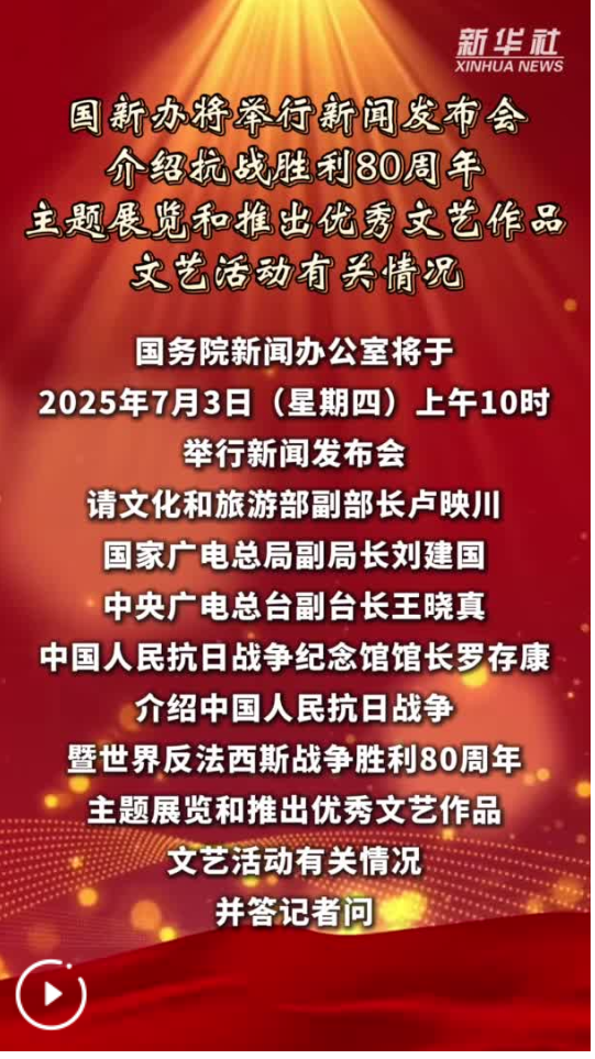 國務院新聞辦公室將于2025年7月3日(星期四)上午10時舉行新聞發布會,請文化和旅游部副部長盧映川、國家廣電總局副局長劉建國、中央廣電總臺副臺長王曉真、中國人民抗日戰爭紀念館館長羅存康介紹中國人民抗日戰爭暨世界反法西斯戰爭勝利80周年主題展覽和推出優秀文藝作品、文藝活動有關情況,并答記者問。(記者 王子銘)