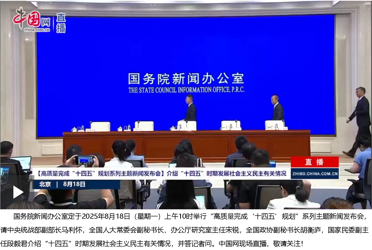 8月18日,國務院新聞辦公室在北京舉行“高質量完成‘十四五’規劃”系列主題新聞發布會。中央統戰部副部長馬利懷,全國人大常委會副秘書長、辦公廳研究室主任宋銳,全國政協副秘書長胡衡廬,國家民委副主任段毅君介紹“十四五”時期發展社會主義民主有關情況,并答記者問。