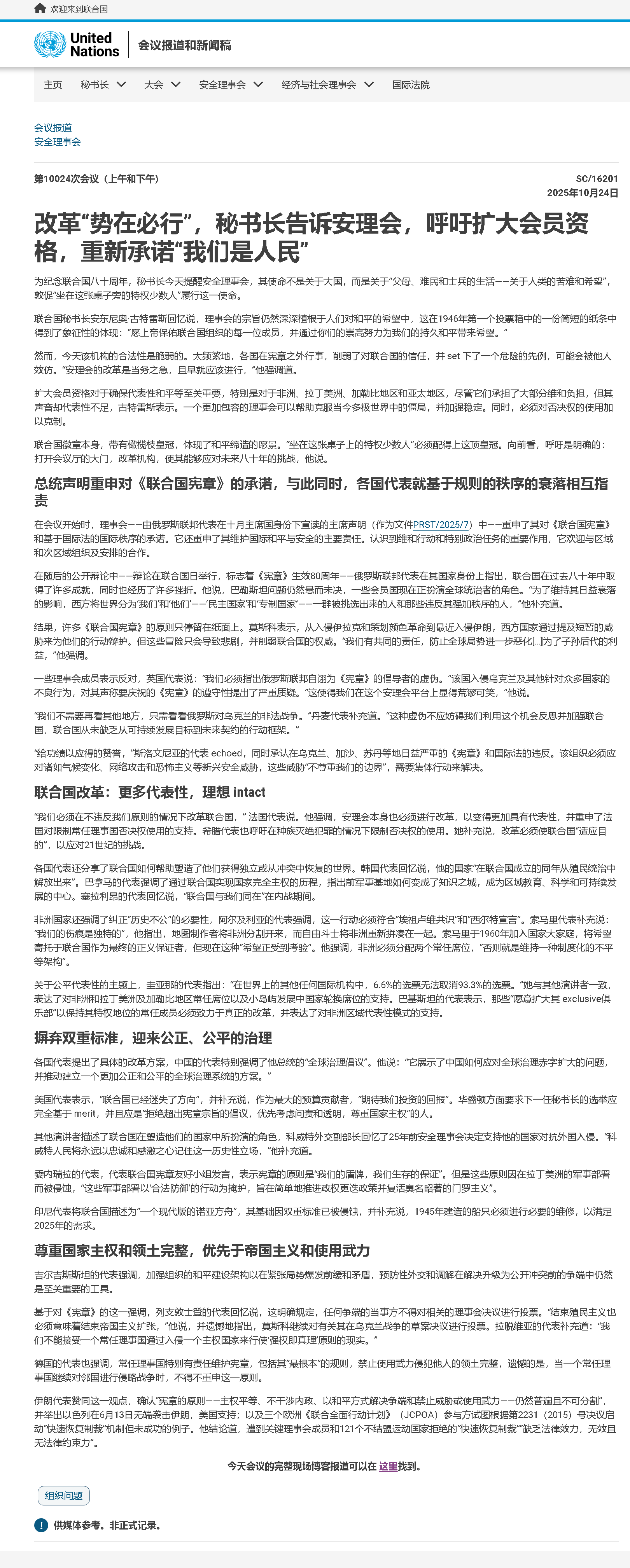 新華社聯合國10月24日電 今年10月24日是《聯合國憲章》生效80周年紀念日。聯合國安理會當天舉行“展望聯合國未來”公開辯論會。中國常駐聯合國代表傅聰在會上發言,他指出中國領導人提出的全球治理倡議對聯合國未來發展具有很強的指導意義。