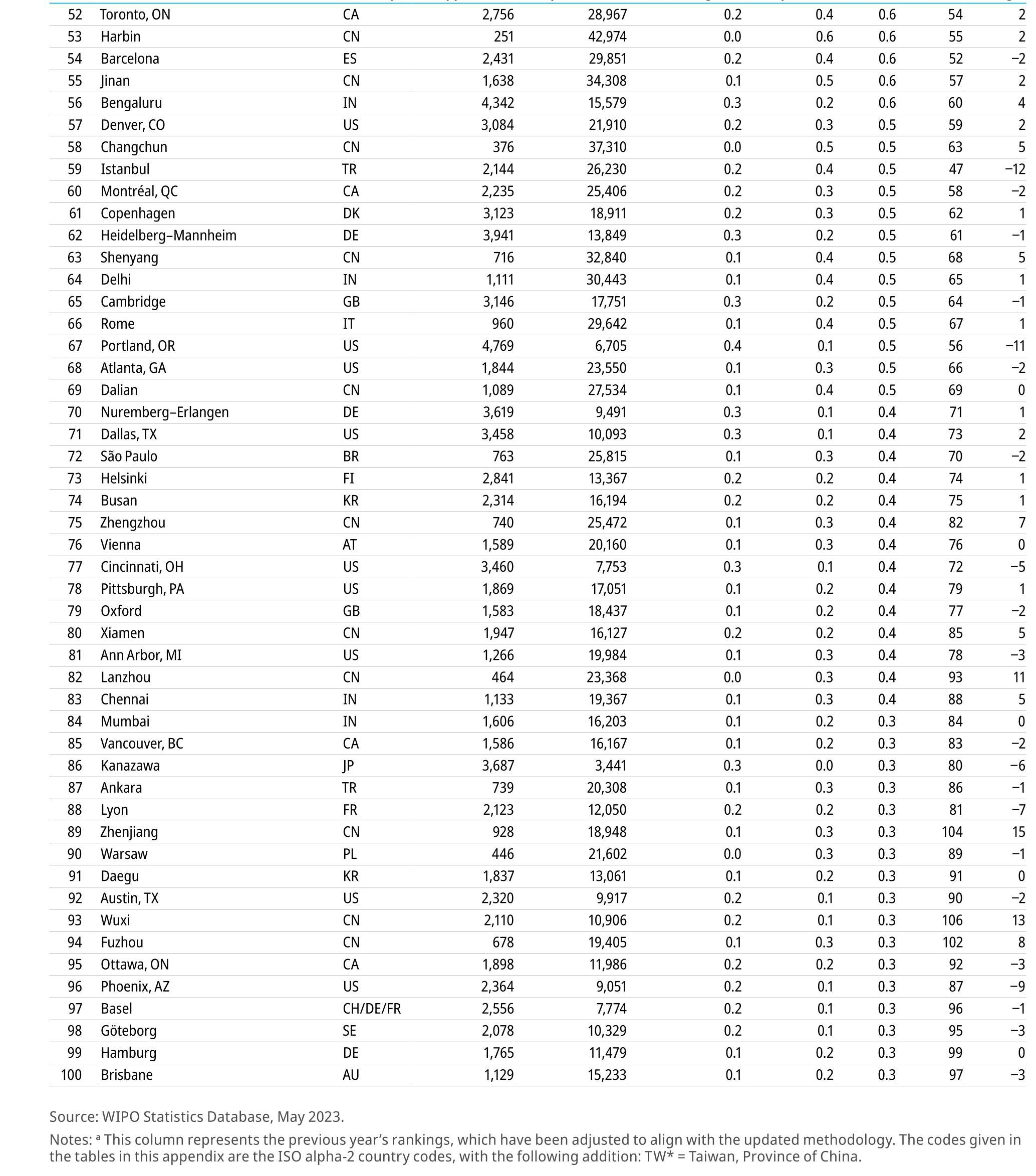 中國有25個科技集群進入全球TOP100榜單,成為擁有全球頂級科技集群最多的國家,并在前五科技集群中占了三位。這25個集群分別為:深圳-香港-廣州(第2位)、北京(4)、上海-蘇州(5)、南京(11)、武漢(13)、杭州(14)、西安(19)、青島(23)、成都(24)、臺北-新竹(27)、天津(36)、長沙(37)、合肥(40)、重慶(44)、哈爾濱(53)、濟南(55)、長春(58)、沈陽(63)、大連(69)、鄭州(75)、廈門(80)、蘭州(82)、鎮江(89)、無錫(93)、福州(94)。成都本次排名比2022年GII著錄排名上升5位。