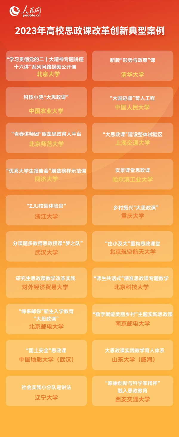 報告根據各高校思政課程的社會反響、信息傳播量、主流媒體關注度、輿論反饋情況等維度,在全國征集推介“北京大學‘學習貫徹黨的二十大精神專題講座十六講’系列網絡視頻公開課”“清華大學新版‘形勢與政策’課”“中國農業大學科技小院‘大思政課’”“中國人民大學‘大國邊疆’育人工程”“哈爾濱工業大學實景課堂思政課”等20個優秀思政課程案例,以期為各高校思政課改革創新提供借鑒啟示。