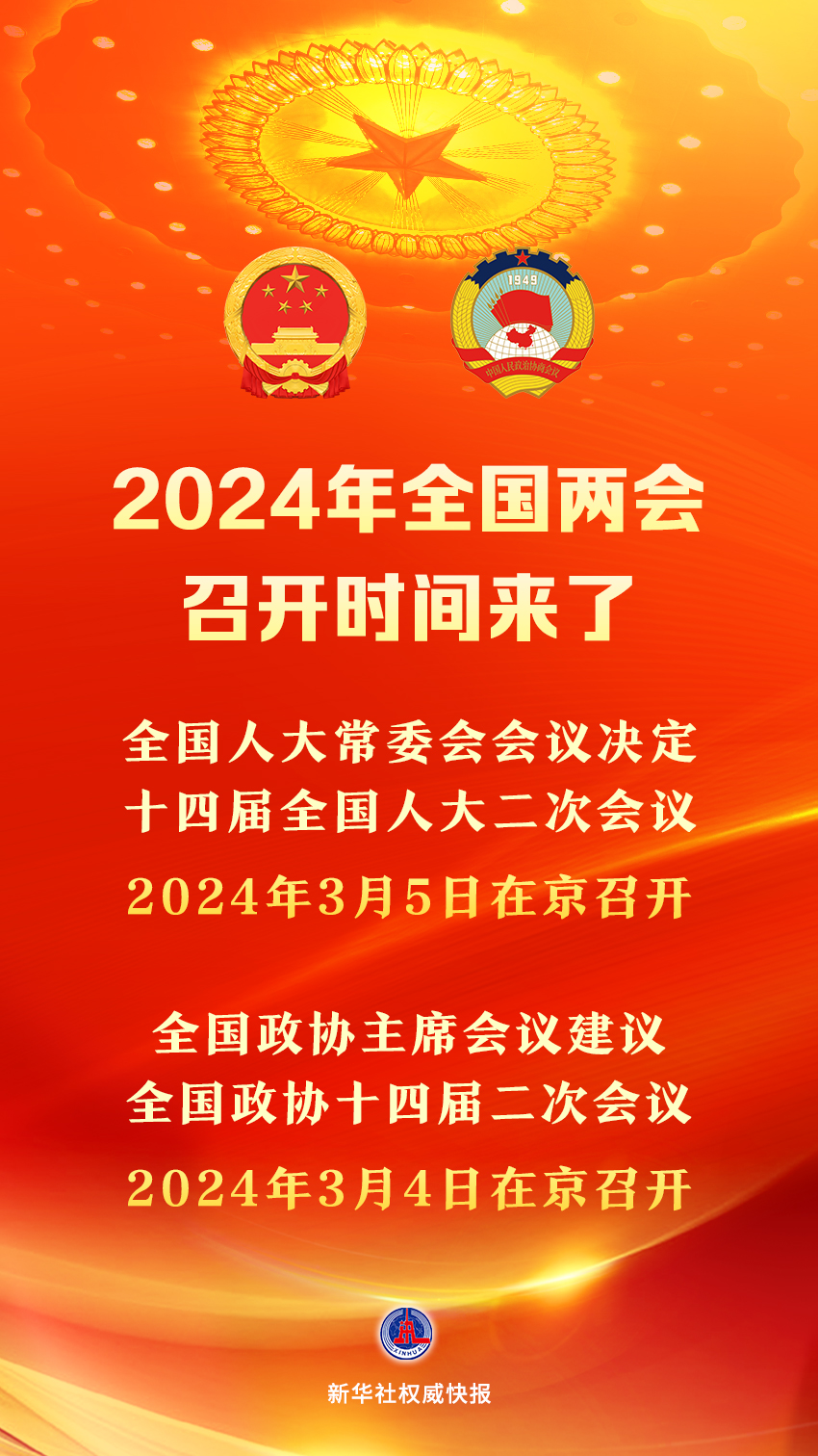 全國人大常委會會議12月29日表決通過了關(guān)于召開十四屆全國人大二次會議的決定。根據(jù)決定,十四屆全國人大二次會議于2024年3月5日在北京召開。政協(xié)第十四屆全國委員會日前召開主席會議,建議全國政協(xié)十四屆二次會議于2024年3月4日在北京召開。