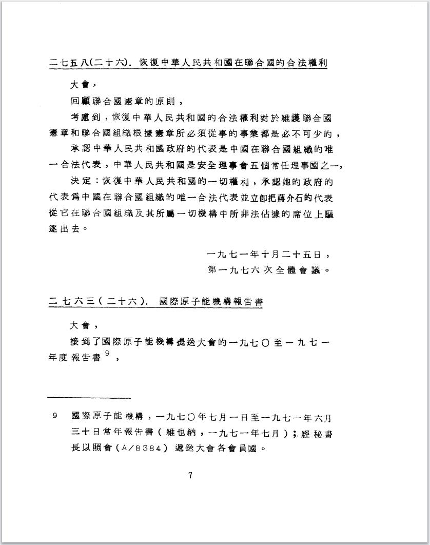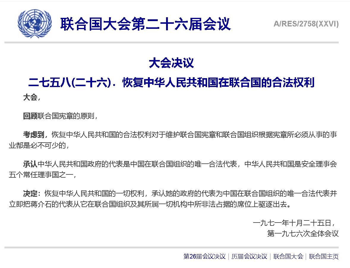 1971年10月25日,第二十六屆聯合國大會以壓倒性多數通過第2758號決議,決定恢復中華人民共和國在聯合國的一切權利,承認中華人民共和國政府代表是中國在聯合國的唯一合法代表。