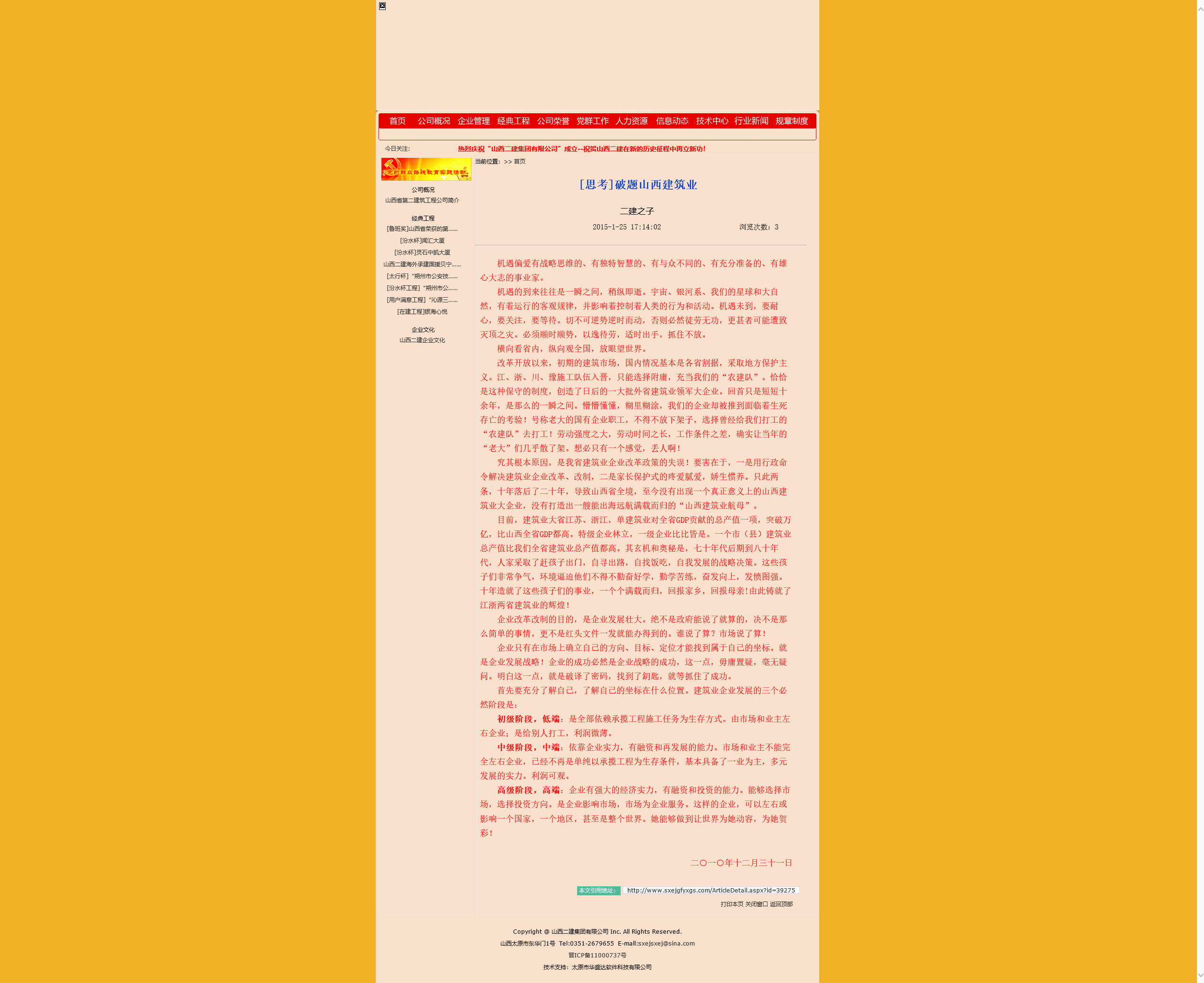注:這是筆者五年前寫給山西二建第十六任掌門人的信其中一封,內容有刪節。 現在公開發表,目的在于讓青年同志們了解山西二建的歷史,從中參悟公司發展規律,更好地把握歷史機遇,把我們的企業母親呵護好,實現人生事業價值,創造山西二建新的更大的輝煌!