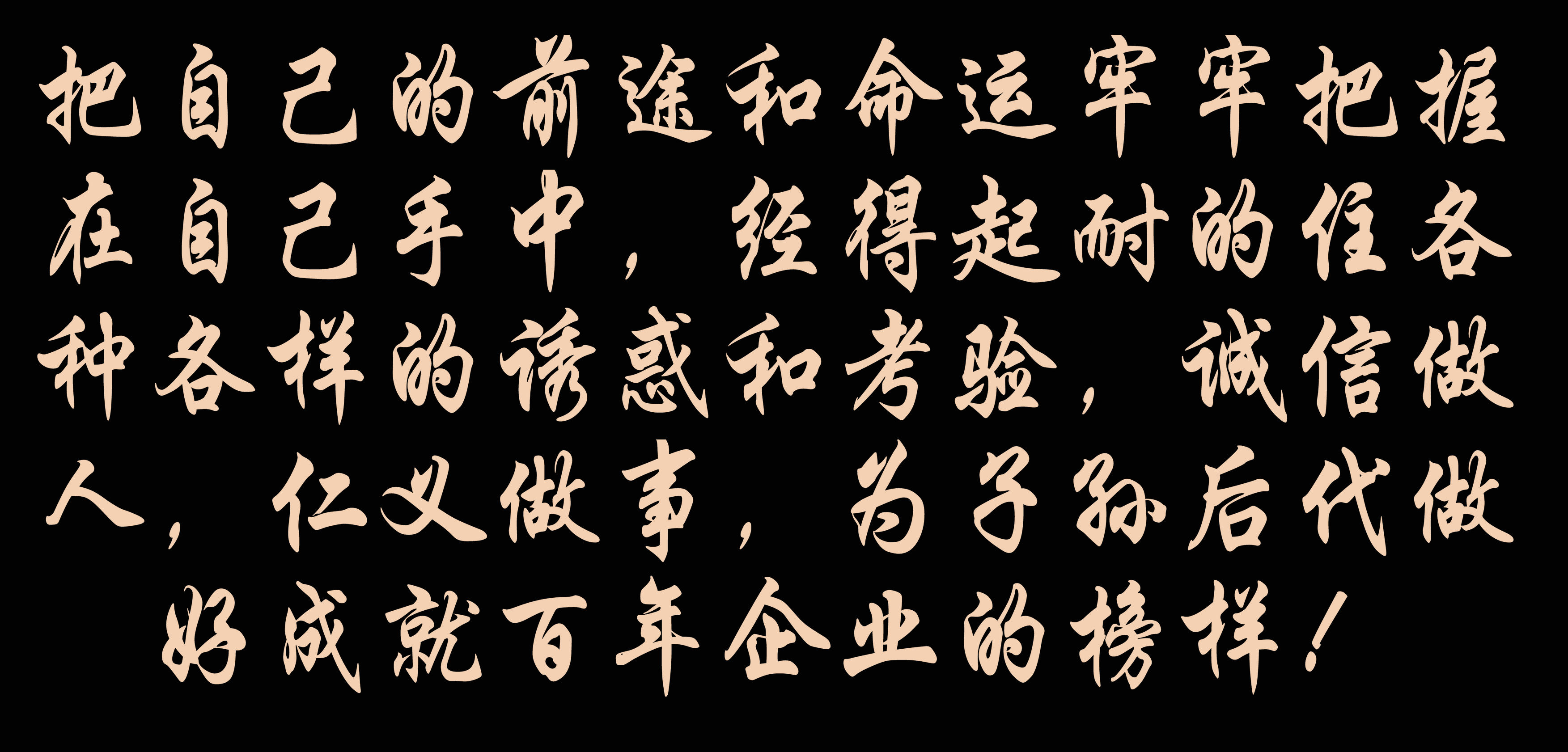 立企之根,成功之本,百年大計,大智靠德!大丈夫仁中取利,真君子義內求財。這就需要轉換思維方式和定力,走大道,行大德,有所為有所不為,堅決不做唯利是圖和歪門邪道的事情,把自己的前途和命運牢牢把握在自己手中,經得起耐的住各種各樣的誘惑和考驗,誠信做人,仁義做事,為子孫后代做好成就百年企業的榜樣!