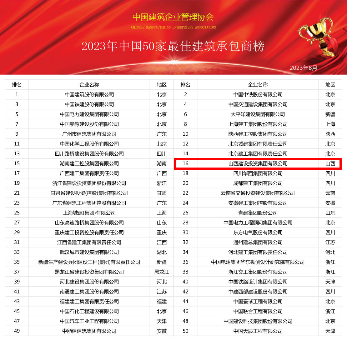 在經(jīng)濟(jì)發(fā)展的浪潮中,建筑業(yè)始終是國家建設(shè)的中流砥柱。近日,由中國建筑企業(yè)管理協(xié)會(huì)隆重發(fā)布的“2024年中國建筑業(yè)綜合實(shí)力100強(qiáng)榜暨中國50家最佳建筑承包商”,這不僅是對建筑企業(yè)的一次高度認(rèn)可,更是為行業(yè)發(fā)展樹立了新的標(biāo)桿。