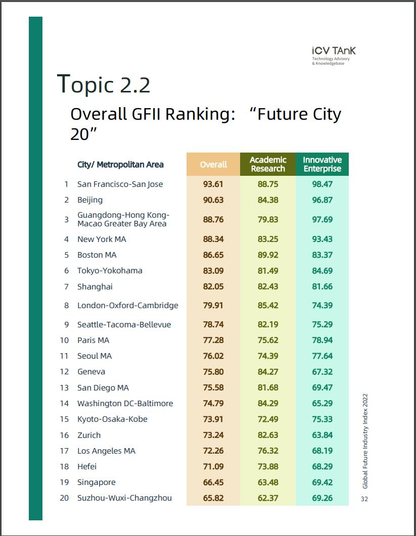 全球著名的科技咨詢機(jī)構(gòu)iCV TAnK日前發(fā)布《2022全球未來產(chǎn)業(yè)發(fā)展指數(shù)》,對(duì)全球未來產(chǎn)業(yè)進(jìn)行了全面、系統(tǒng)排名。其中,北京在“未來之城”綜合排名中居全球第二,在科研設(shè)施指標(biāo)上排名第一。