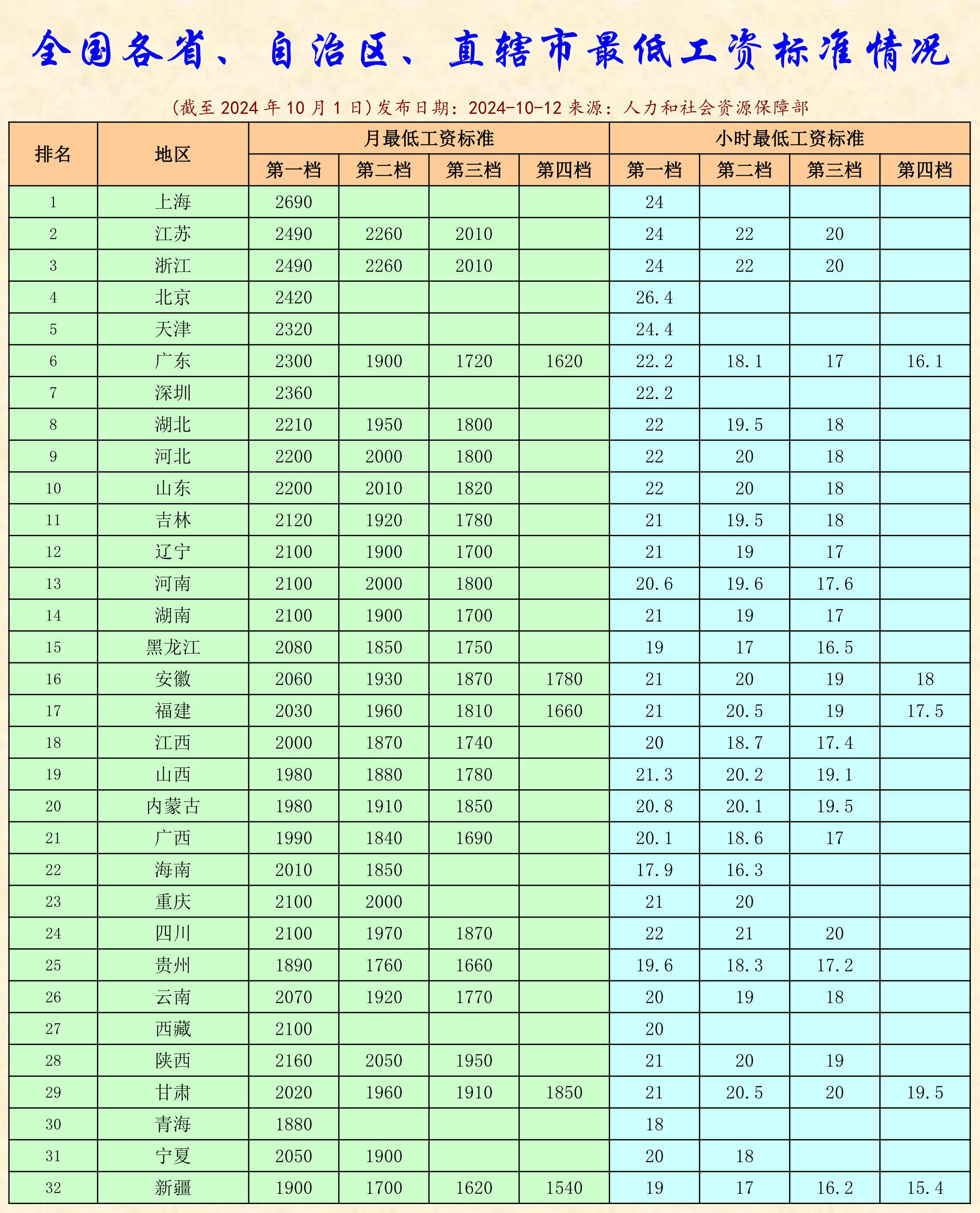根據新規,將全日制用工月最低工資標準調整為 一類2150元、二類2050元、三類1950元。同時, 相應提高小時最低工資標準。全日制用工小時最低工資標準依次為一類12.4元、二類11.8元、三類11.2元;非全日制用工小時最低工資標準依次為一類23.2元、二類22.1元、三類20.9元。