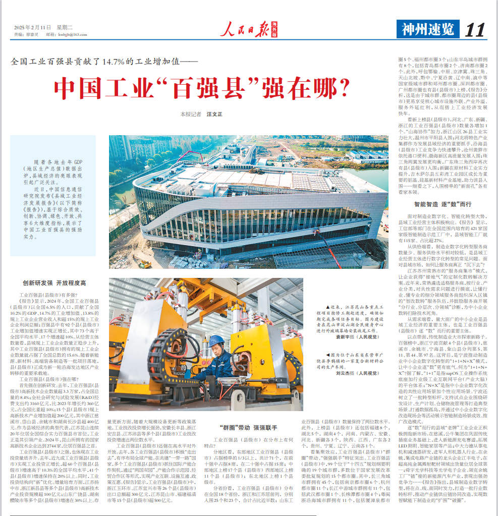 首先強(qiáng)在創(chuàng)新研發(fā)。去年,工業(yè)百強(qiáng)縣(縣級市)高新技術(shù)企業(yè)數(shù)量超3.3萬家,占全國總量的8.4%;全社會研究與試驗(yàn)發(fā)展(R&D)經(jīng)費(fèi)支出約3160億元,比2023年增長約360億元,占全國比重超10%;15個(gè)縣(縣級市)規(guī)上高新技術(shù)產(chǎn)業(yè)增加值超200億元,其中浙江慈溪市、岱山縣、余姚市和湖南長沙縣超400億元。作為縣域經(jīng)濟(jì)的典型代表,江蘇昆山連續(xù)20年位居全國綜合實(shí)力百強(qiáng)縣市首位,工業(yè)正是其引領(lǐng)產(chǎn)業(yè)。2024年,昆山所擁有的國家高新技術(shù)企業(yè)達(dá)到2744家,位居百強(qiáng)縣之首。