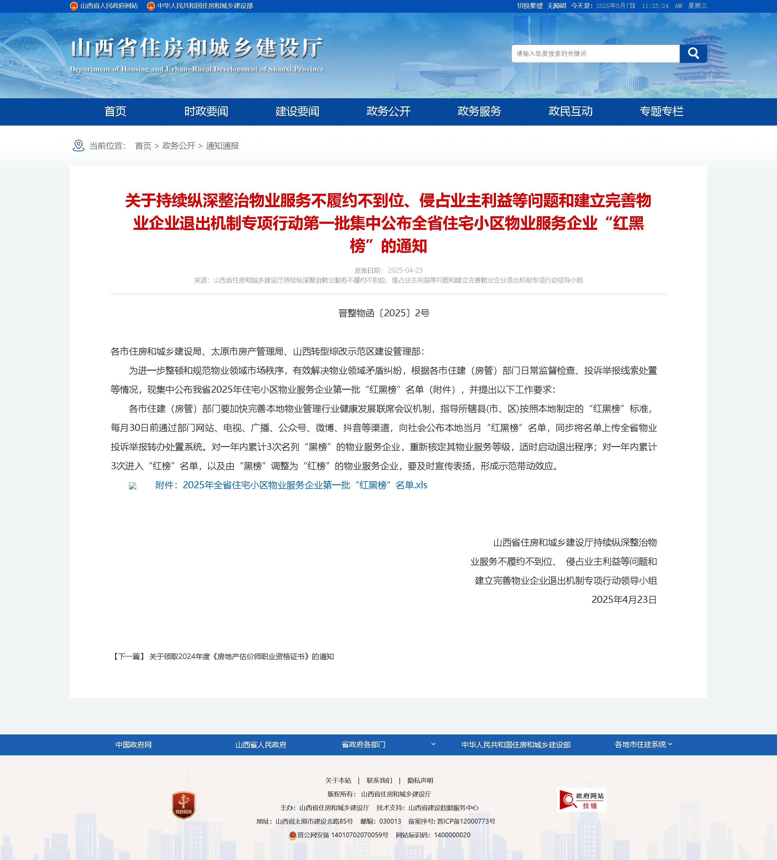 本報訊(記者晉帥妮)近日,為進一步整頓和規(guī)范物業(yè)領(lǐng)域市場秩序,有效解決物業(yè)領(lǐng)域矛盾糾紛,省住建廳根據(jù)各市住建(房管)部門日常監(jiān)督檢查、投訴舉報線索處置等情況,公布我省2025年住宅小區(qū)物業(yè)服務(wù)企業(yè)第一批“紅黑榜”名單,共計304家企業(yè)登上紅榜,146家企業(yè)被列入黑榜。