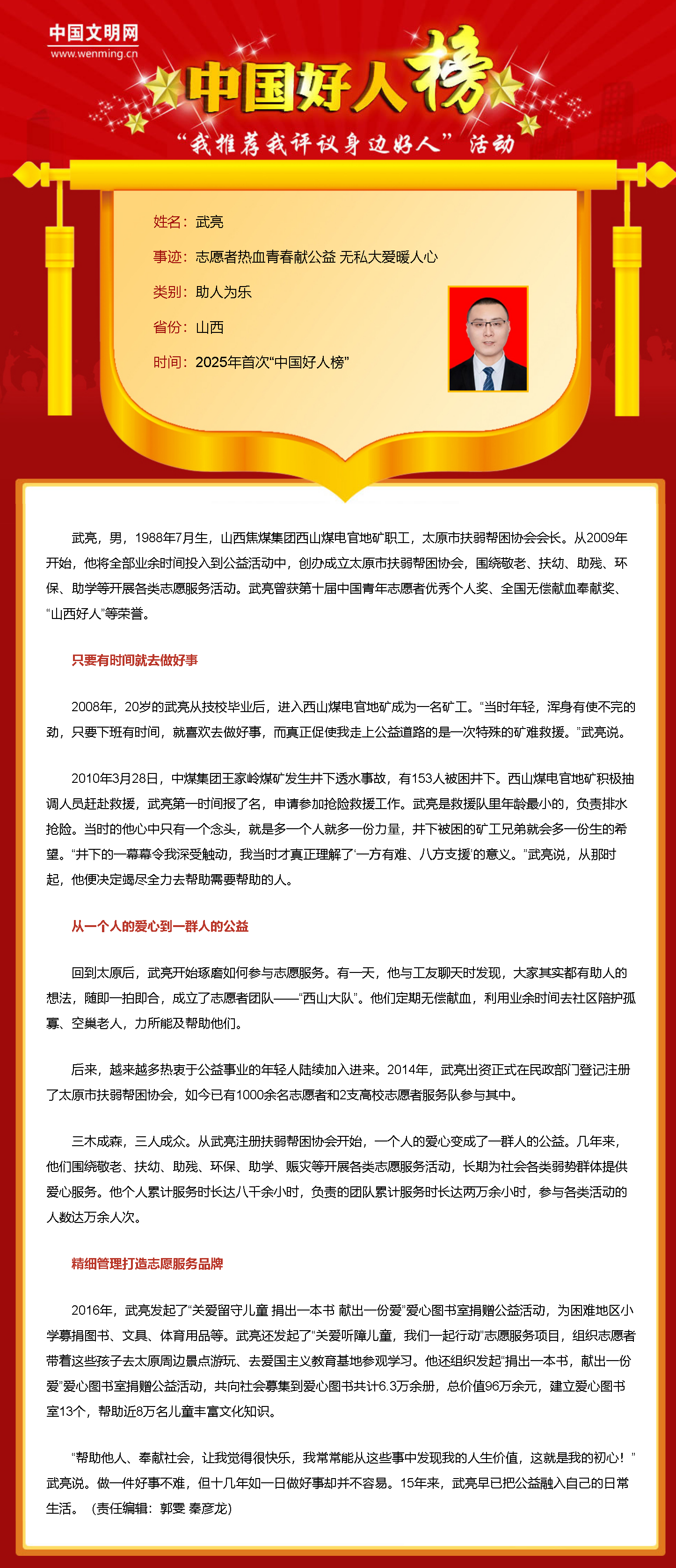 6月24日,2025年首次“中國好人榜”發布儀式暨全國道德模范與身邊好人現場交流活動在河南省安陽市舉辦。經各地推薦、網友評議和專家評審等環節,共有152人(組)身邊好人光榮上榜。太原市扶弱幫困協會會長武亮因助人為樂上榜,是太原市也是山西省唯一獲此殊榮者。
