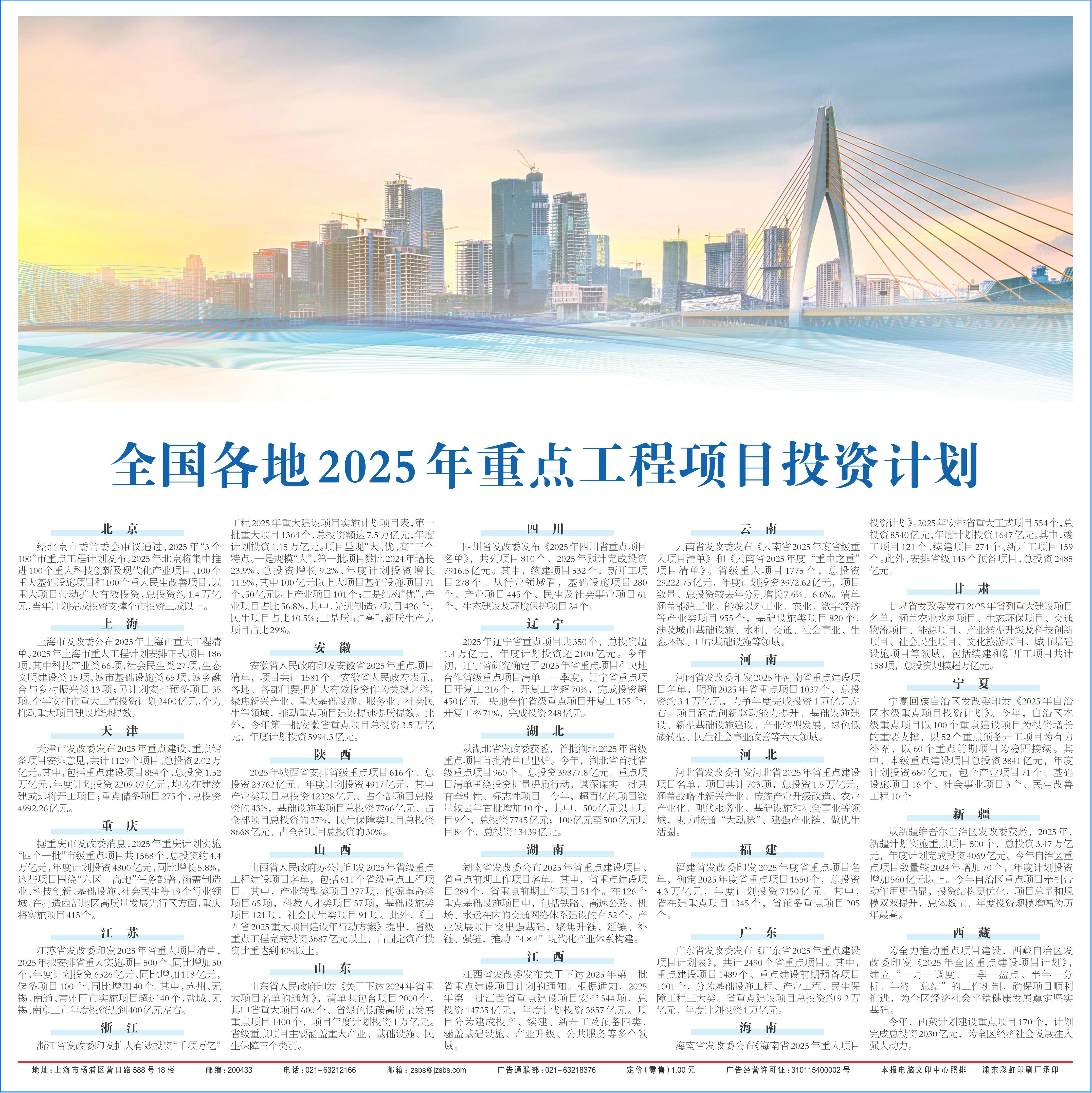 上海市發改委公布2025年上海市重大工程清單。2025年上海市重大工程計劃安排正式項目186項,其中科技產業類66項,社會民生類27項,生態文明建設類15項,城市基礎設施類65項,城鄉融合與鄉村振興類13項;另計劃安排預備項目35項。全年安排市重大工程投資計劃2400億元,全力推動重大項目建設增速提效。