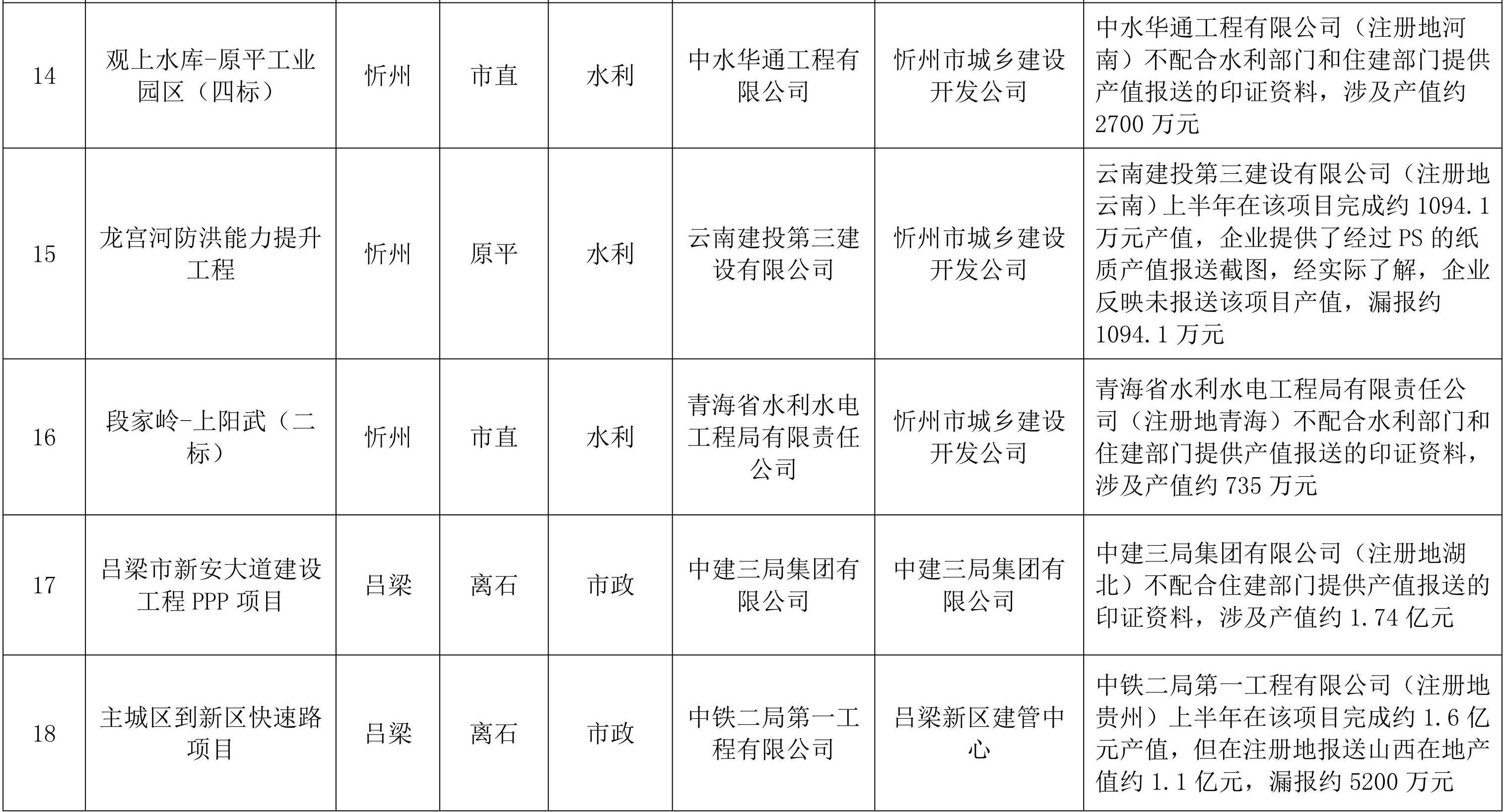 按照安排,省建筑業運行工作專班于2025年7月28日至8月8日開展了全省建筑業運行情況督查檢查工作,實地核查了11個市38個縣(市、區)和山西轉型綜合改革示范區的120個在建項目。督查中發現部分項目施工企業存在產值漏報、數據造假、不配合行業部門提供印證資料等問題,違反了《中華人民共和國統計法》第八條“國家機關、企業事業單位和其他組織以及個體工商戶和個人等統計調查對象,必須依照本法和國家有關規定,真實、準確、完整、及時地提供統計調查所需的資料,不得提供不真實或者不完整的統計資料,不得遲報、拒報統計資料”規定,無法真實反映我省建筑業在地產值情況,給國家和我省經濟造成損失。