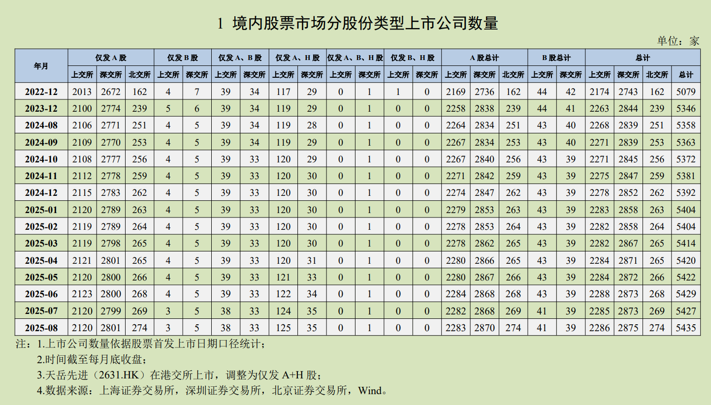 中國上市公司協(xié)會(huì)最新發(fā)布的數(shù)據(jù)顯示,截至2025年8月31日,境內(nèi)股票市場共有上市公司5435家,滬、深、北證券交易所分別為2286、2875、274家。