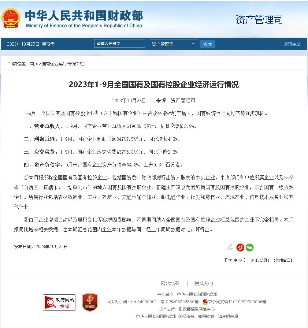 中新網(wǎng)10月27日電 財(cái)政部網(wǎng)站27日發(fā)布2023年1-9月全國國有及國有控股企業(yè)經(jīng)濟(jì)運(yùn)行情況,1-9月,全國國有及國有控股企業(yè)(以下稱國有企業(yè))主要效益指標(biāo)穩(wěn)定增長,國有經(jīng)濟(jì)運(yùn)行向好態(tài)勢逐步鞏固。