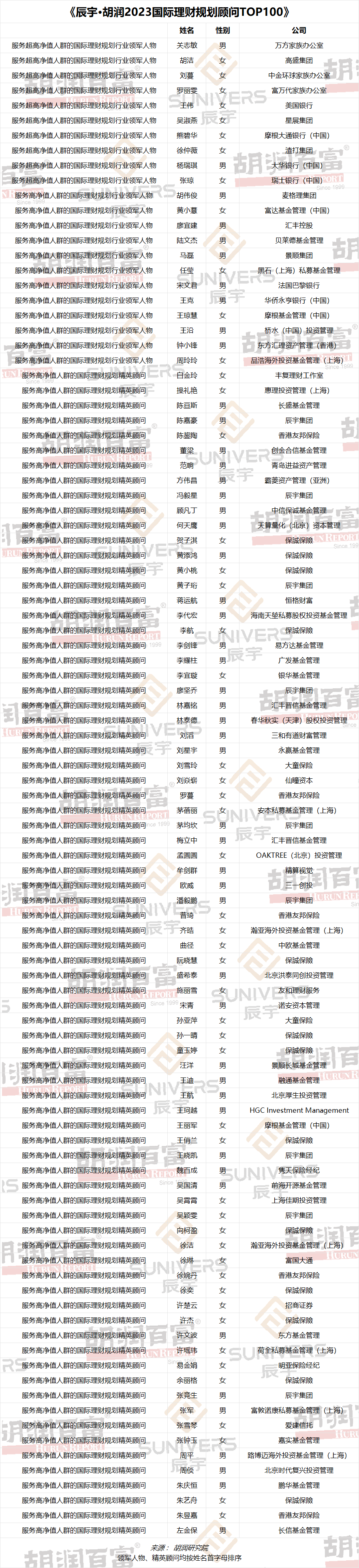胡潤研究院發布《辰宇·胡潤2023國際理財規劃顧問TOP100》
