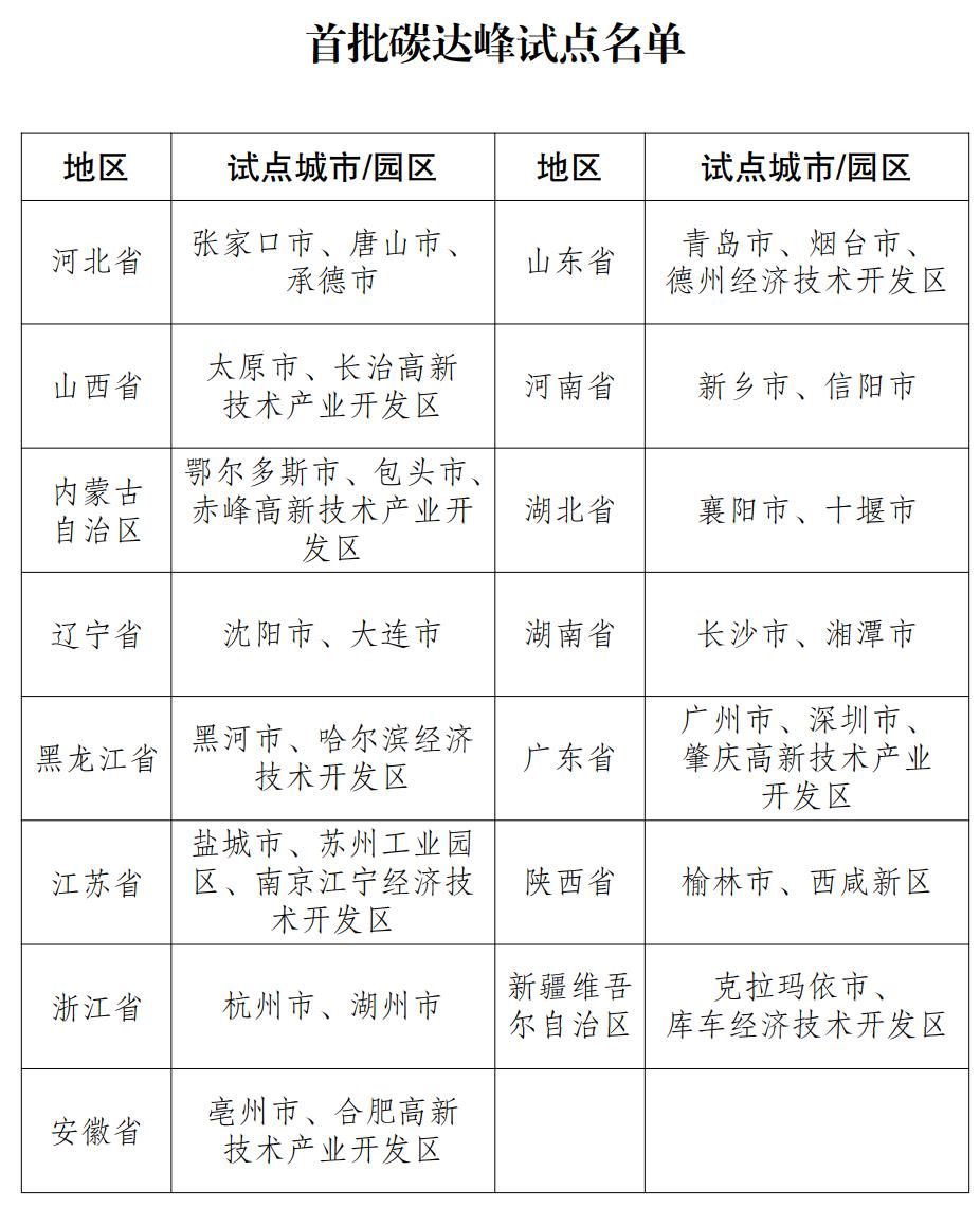 為落實國務院《2030年前碳達峰行動方案》(國發(fā)〔2021〕23號)有關部署,按照《國家碳達峰試點建設方案》(發(fā)改環(huán)資〔2023〕1409號)工作安排,經有關地區(qū)城市和園區(qū)自愿申報、省級發(fā)展改革委推薦、省級人民政府審核、國家發(fā)展改革委復核,確定張家口市等25個城市、長治高新技術產業(yè)開發(fā)區(qū)等10個園區(qū)為首批碳達峰試點城市和園區(qū),現予公布,并就有關事項通知如下: