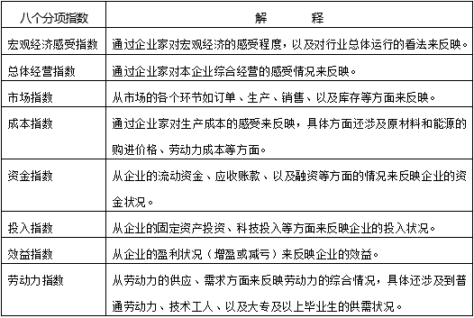 在行業選取的過程中,依據國民經濟各行業對GDP的貢獻度,共選取了工業、建筑業、交通運輸郵政倉儲業、房地產業、批發零售業、社會服務業、信息傳輸計算機服務和軟件業、住宿餐飲業等八大行業。每個行業的調查內容,具體包括八個大的分項:宏觀經濟感受、總體經營、市場、成本、資金、投入、效益、勞動力。在具體調查過程中,考慮到不同行業的特點,八個大的分項里面的細項調查有所區別。