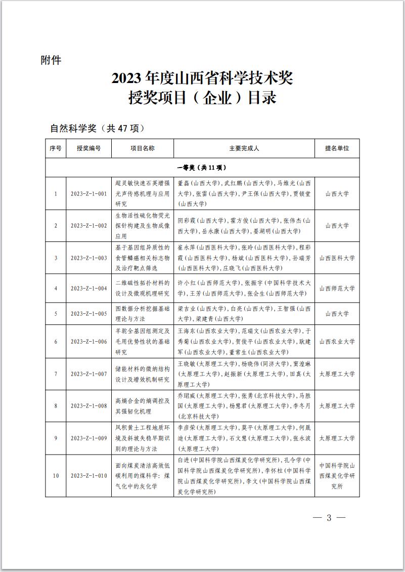根據(jù)《山西省科學(xué)技術(shù)獎勵辦法》的規(guī)定,經(jīng)省科學(xué)技術(shù)獎勵評審委員會評審、省科學(xué)技術(shù)獎勵委員會審定,省政府批準(zhǔn),授予“非經(jīng)典光源制備關(guān)鍵技術(shù)及應(yīng)用”和“煤基固廢中鋰鋁戰(zhàn)略資源高值利用的關(guān)鍵技術(shù)及應(yīng)用”2個項目特等獎,授予“超靈敏快速石英增強(qiáng)光聲傳感機(jī)理與應(yīng)用研究”等35個項目一等獎,授予“剪切/振動耦合超常動態(tài)凝固理論與方法”等158個項目二等獎,授予“山西航天清華裝備有限責(zé)任公司”等6家單位企業(yè)技術(shù)創(chuàng)新獎。
