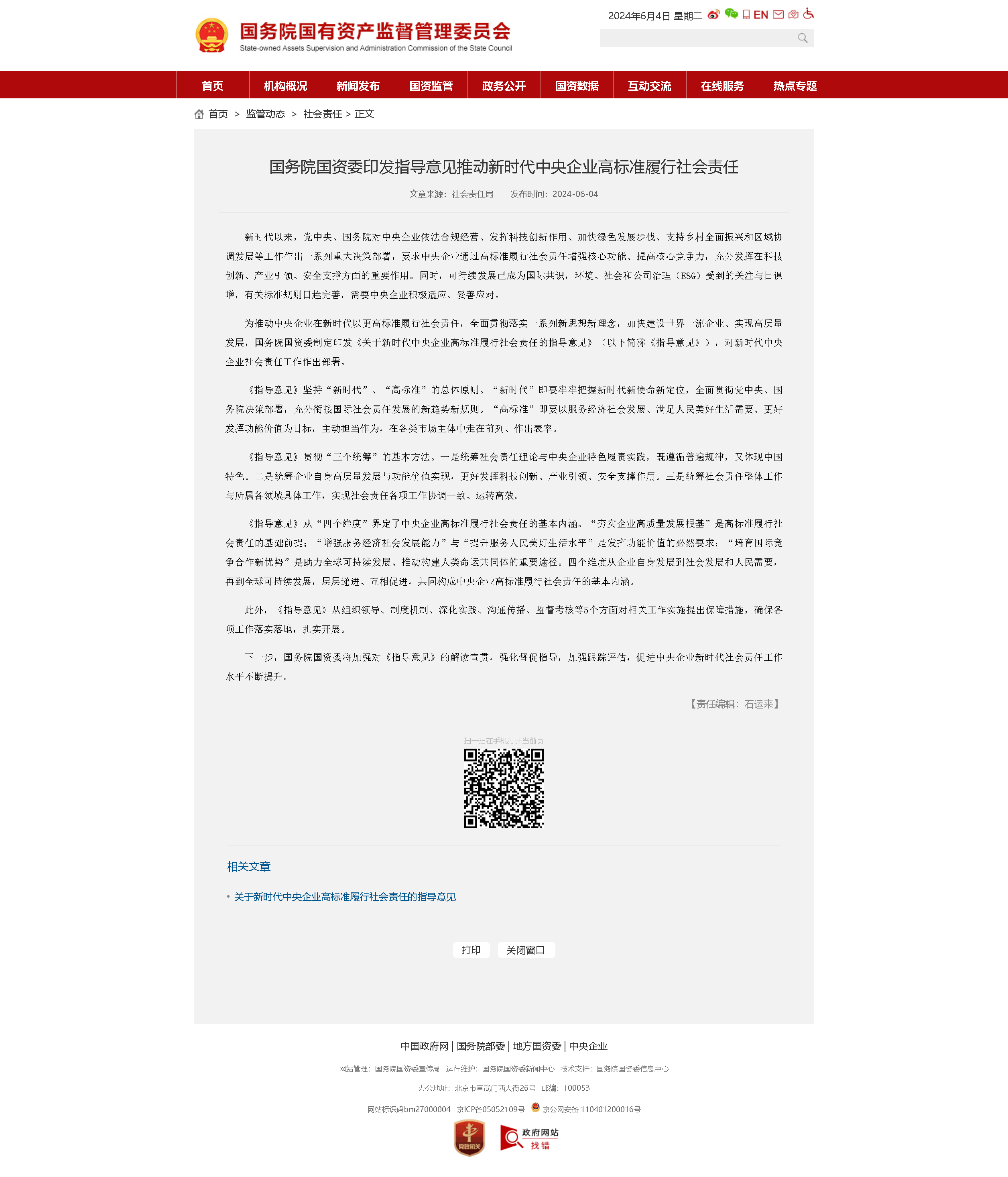 (十二)切實(shí)加強(qiáng)環(huán)境、社會和公司治理(ESG)工作。將ESG工作納入社會責(zé)任工作統(tǒng)籌管理,積極把握、應(yīng)對ESG發(fā)展帶來的機(jī)遇和挑戰(zhàn)。推動控股上市公司圍繞ESG議題高標(biāo)準(zhǔn)落實(shí)環(huán)境管理要求、積極履行社會責(zé)任、健全完善公司治理,加強(qiáng)高水平ESG信息披露,不斷提高ESG治理能力和績效水平,增強(qiáng)在資本市場的價值認(rèn)同。推動海外經(jīng)營機(jī)構(gòu)在海外經(jīng)營管理、重大項(xiàng)目實(shí)施中將ESG工作作為重要內(nèi)容,主動適應(yīng)所在國家、地區(qū)ESG規(guī)范要求,強(qiáng)化ESG治理、實(shí)踐和信息披露,持續(xù)提升國際市場競爭力。