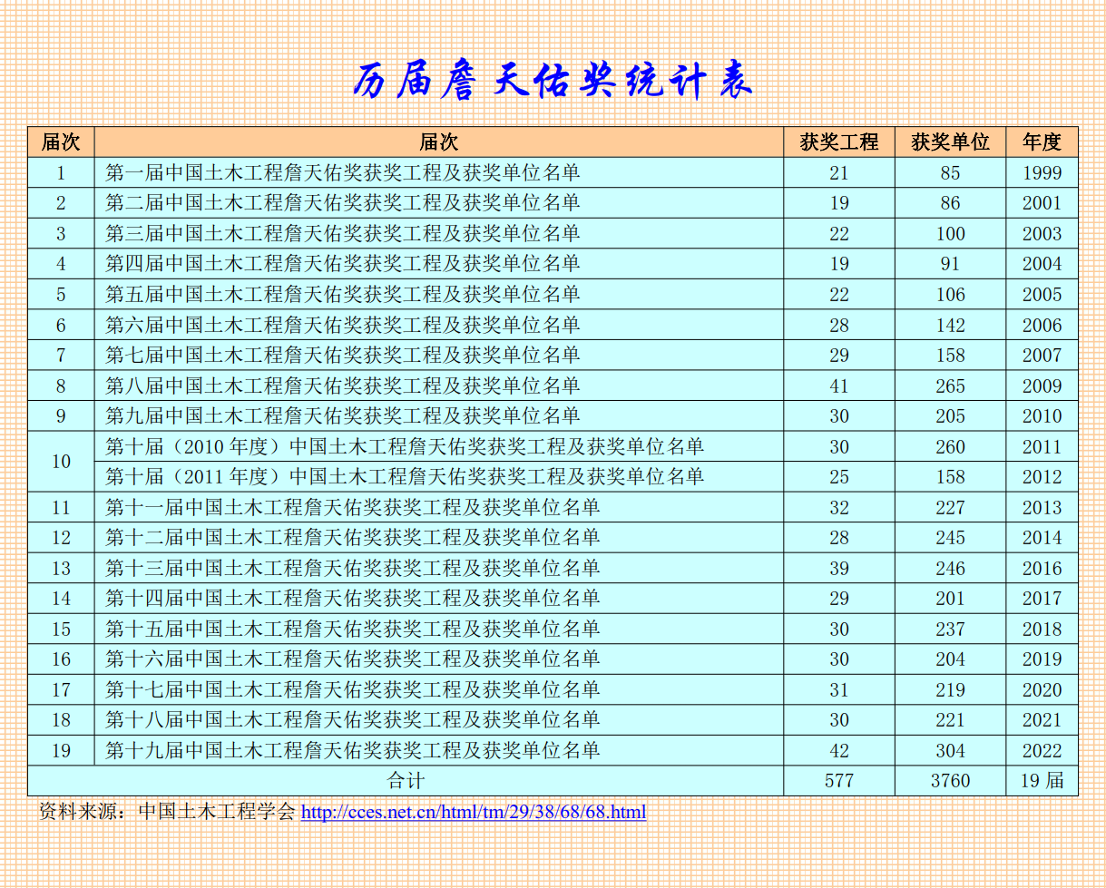 歷屆詹天佑獎(jiǎng)獲獎(jiǎng)工程及獲獎(jiǎng)單位總名單1999-2022