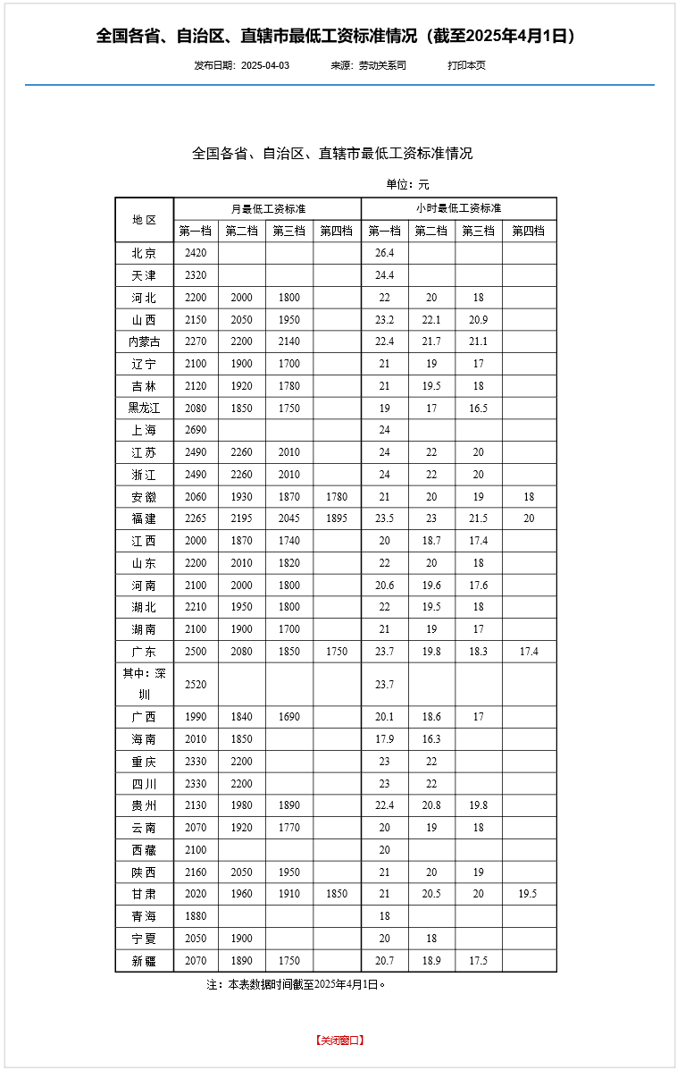 全國各省、自治區(qū)、直轄市最低工資標準情況(截至2025年4月1日)