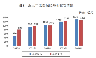 全年有 224 萬人享受工傷保險待遇。全年工傷保險基金收入 1321 億元,基金支出 1298 億元,年末工傷保險基金累計結余 1439 億元(含儲備金 116 億元)。