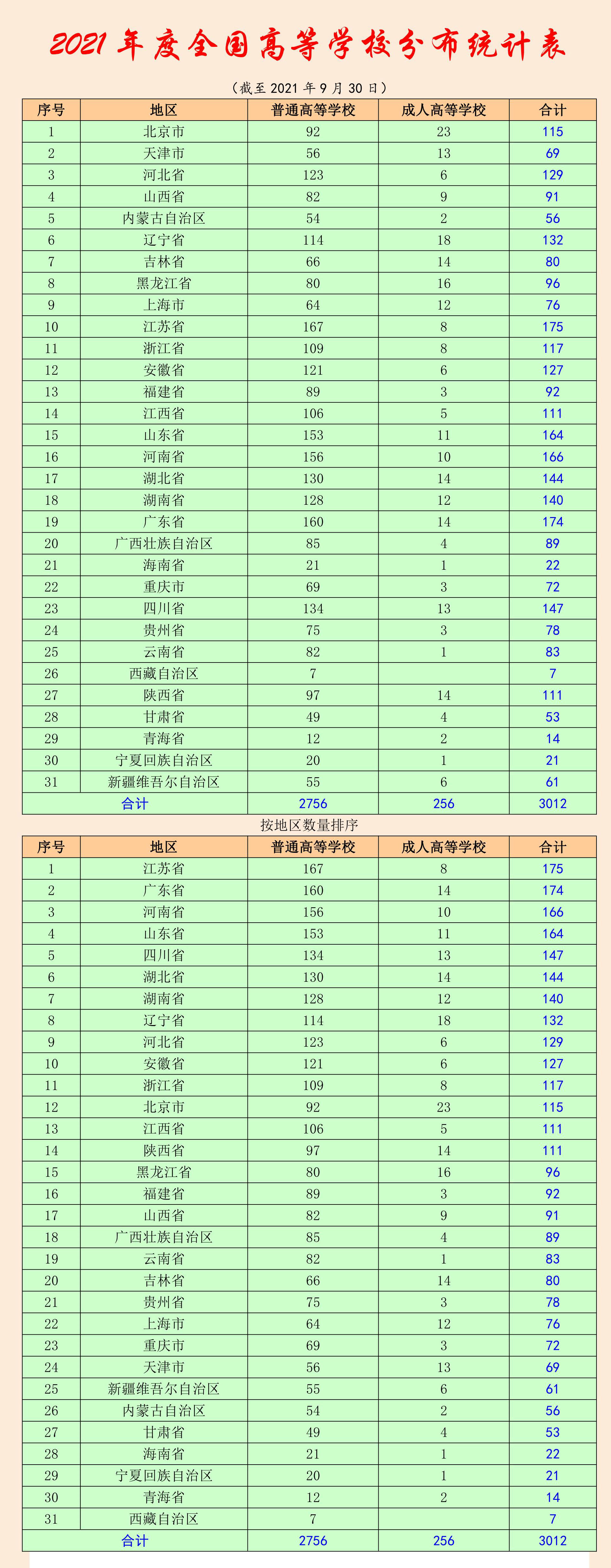 截至2023年6月15日,全國高等學校共計3072所,其中:普通高等學校2820所,含本科院校1275所、高職(專科)院校1545所;成人高等學校252所。本名單未包含港澳臺地區(qū)高等學校。