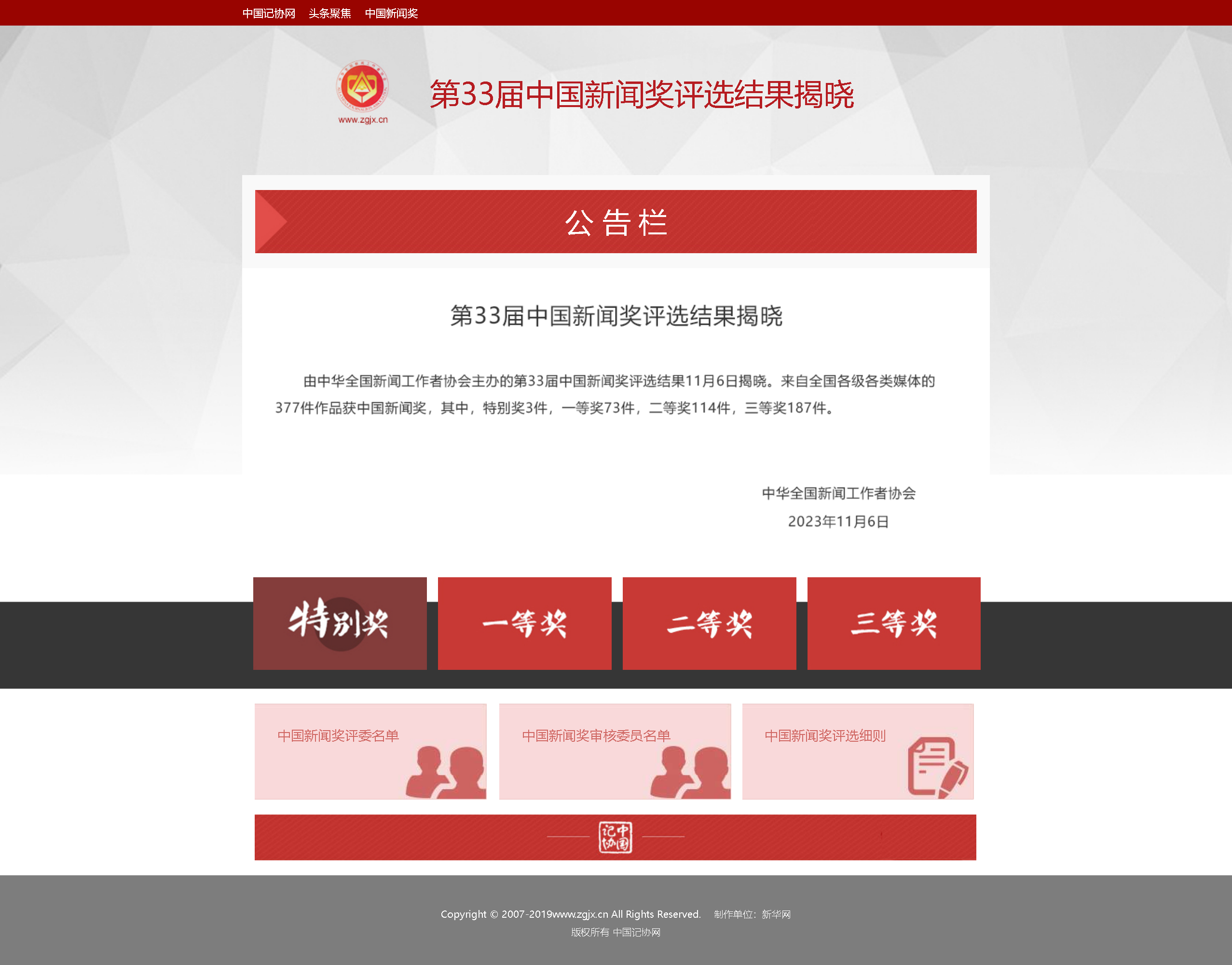 新華社北京11月6日電 由中華全國新聞工作者協會主辦的第33屆中國新聞獎評選結果11月6日揭曉。來自全國各級各類媒體的377件作品獲中國新聞獎,其中,特別獎3件,一等獎73件,二等獎114件,三等獎187件。