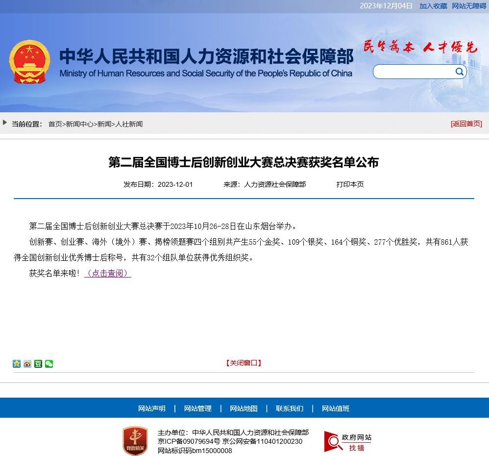 創(chuàng)新賽、創(chuàng)業(yè)賽、海外(境外)賽、揭榜領(lǐng)題賽四個(gè)組別共產(chǎn)生55個(gè)金獎(jiǎng)、109個(gè)銀獎(jiǎng)、164個(gè)銅獎(jiǎng)、277個(gè)優(yōu)勝獎(jiǎng),共有861人獲得全國(guó)創(chuàng)新創(chuàng)業(yè)優(yōu)秀博士后稱(chēng)號(hào),共有32個(gè)組隊(duì)單位獲得優(yōu)秀組織獎(jiǎng)。