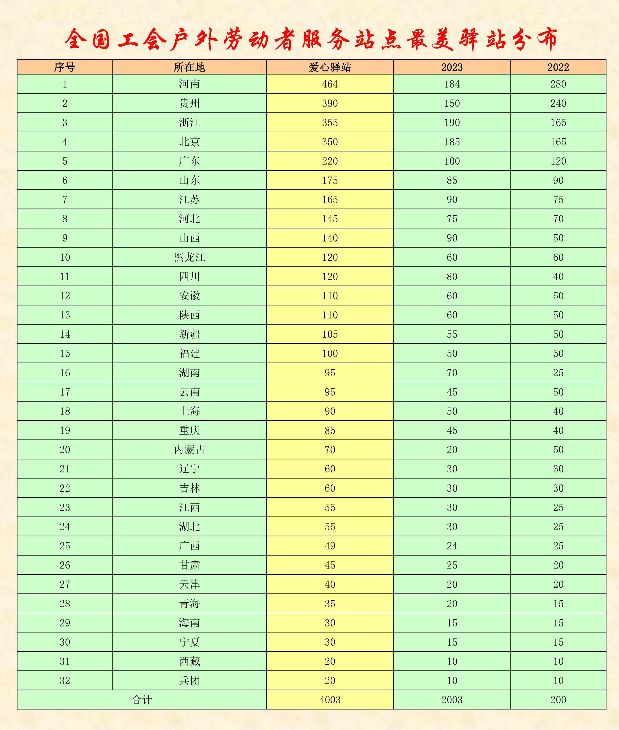 2021年以來(lái),全總已推樹(shù)5500個(gè)最美驛站,投入資金2750萬(wàn)元,覆蓋全國(guó)31個(gè)省、自治區(qū)、直轄市和新疆生產(chǎn)建設(shè)兵團(tuán)。“十四五”期間,全總計(jì)劃推樹(shù)1萬(wàn)個(gè)最美驛站,并給予資金獎(jiǎng)補(bǔ),旨在通過(guò)典型引路和示范帶動(dòng),進(jìn)一步規(guī)范工會(huì)驛站工作,推動(dòng)各級(jí)工會(huì)持續(xù)提升驛站服務(wù)針對(duì)性、實(shí)效性,增強(qiáng)服務(wù)均衡性和可及性,依托工會(huì)驛站凝聚社會(huì)力量,做好戶外勞動(dòng)者關(guān)心關(guān)愛(ài)工作。