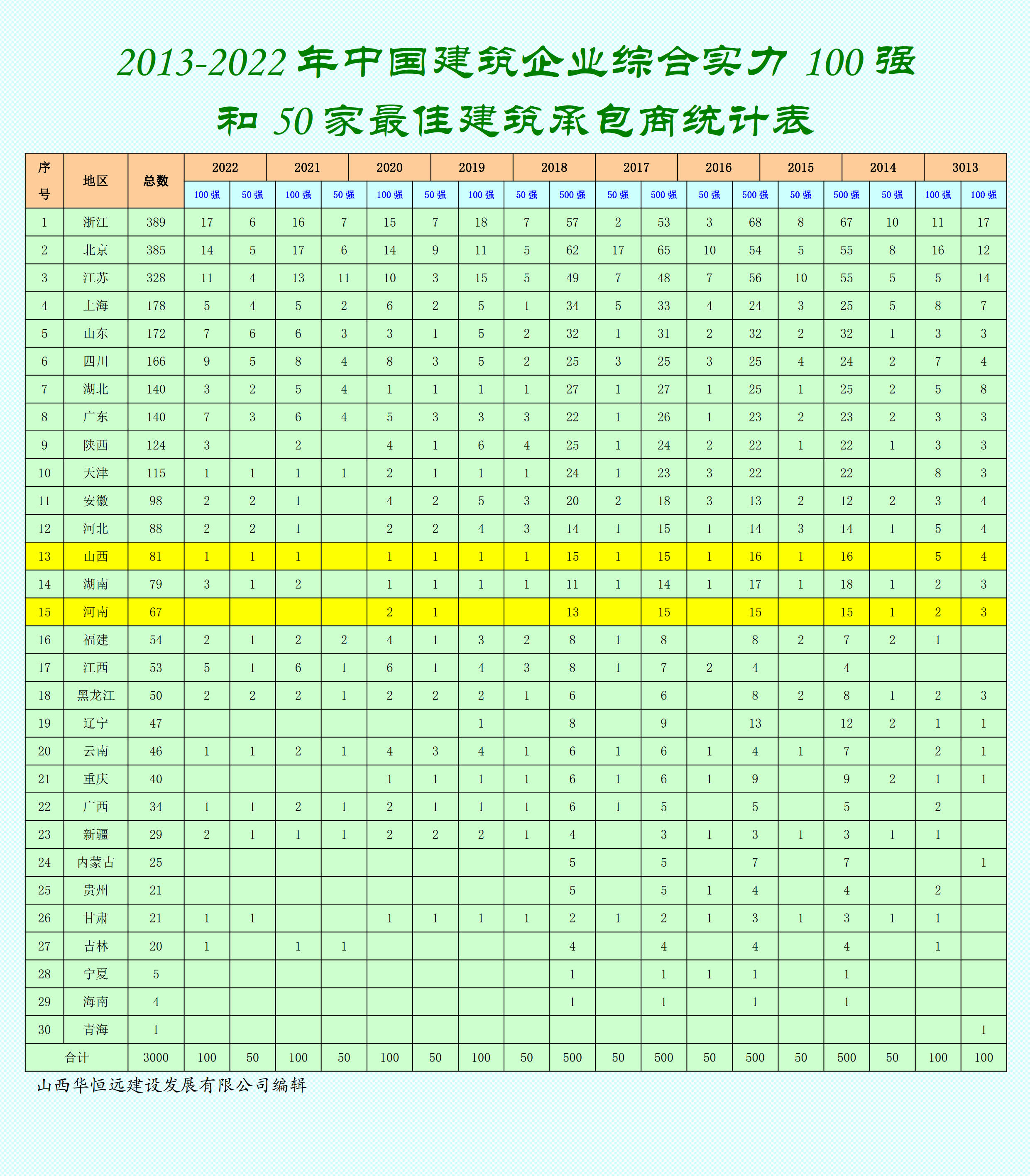 2013-2022年中國建筑企業(yè)綜合實力100強和50家最佳建筑承包商排行榜?
