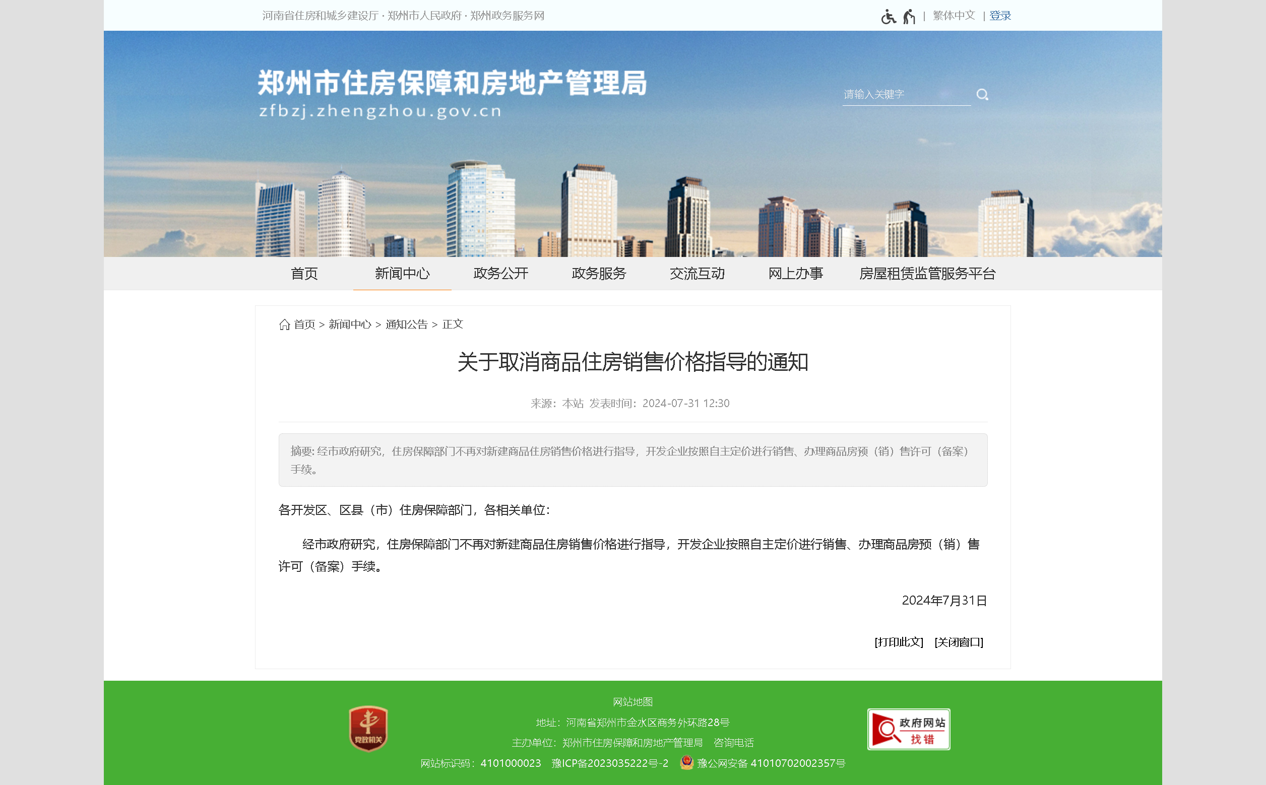 新華社鄭州7月31日電(記者翟濯)記者31日從鄭州市住房保障和房地產(chǎn)管理局獲悉,經(jīng)鄭州市政府研究,鄭州住房保障部門(mén)不再對(duì)新建商品住房銷(xiāo)售價(jià)格進(jìn)行指導(dǎo),開(kāi)發(fā)企業(yè)按照自主定價(jià)進(jìn)行銷(xiāo)售、辦理商品房預(yù)(銷(xiāo))售許可(備案)手續(xù)。