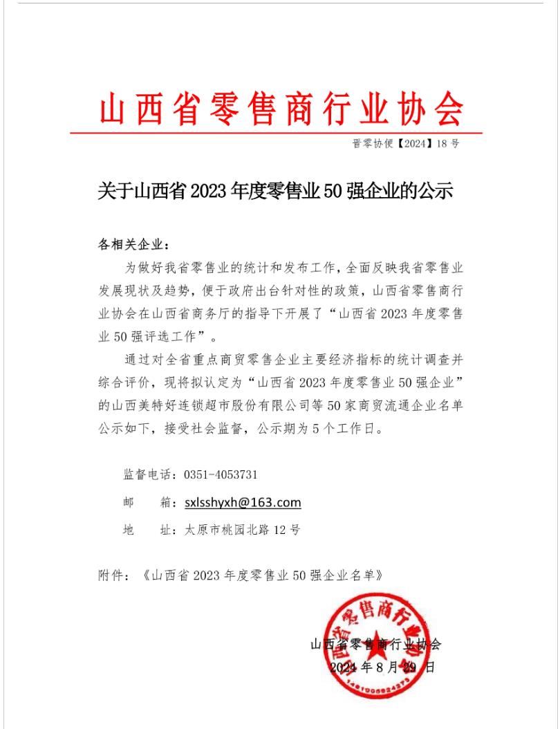 通過對全省重點商貿(mào)零售企業(yè)主要經(jīng)濟指標的統(tǒng)計調(diào)查并綜合評價,現(xiàn)將擬認定為“山西省2023年度零售業(yè)50強企業(yè)”的山西美特好連鎖超市股份有限公司等50家商貿(mào)流通企業(yè)名單公示如下,接受社會監(jiān)督,公示期為5個工作日。美特好以85.9165億雄踞榜首。