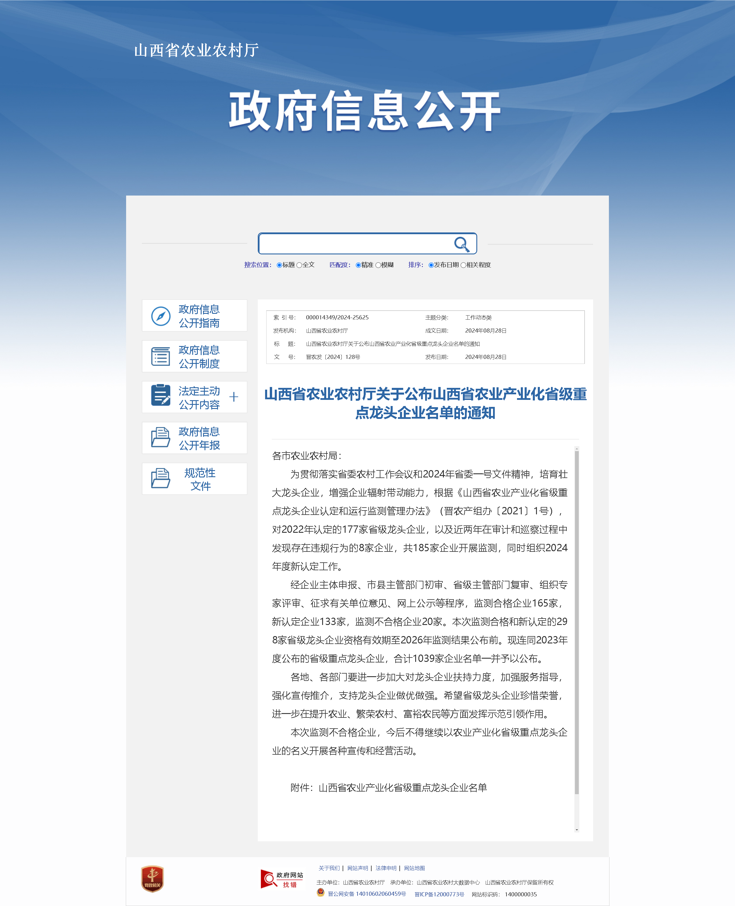 【綜合信息】2024年山西省農業產業化省級重點龍頭企業名單