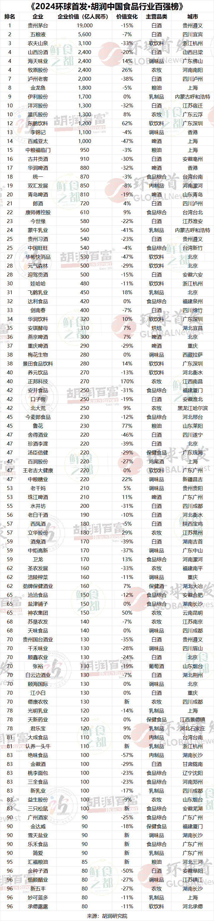 【綜合信息】2024環球首發·胡潤中國食品行業百強榜