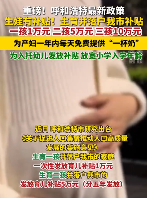 3月13日,內蒙古呼和浩特市發布落實《關于促進人口集聚推動人口高質量發展的實施意見》育兒補貼項目實施細則及服務流程。發放育兒補貼實施細則如下:生育一孩一次性發放育兒補貼1萬元;生育二孩發放育兒補貼5萬元,按照每年1萬元發放,直至孩子5周歲;生育三孩及以上發放育兒補貼10萬元,按照每年1萬元發放,直至孩子10周歲。