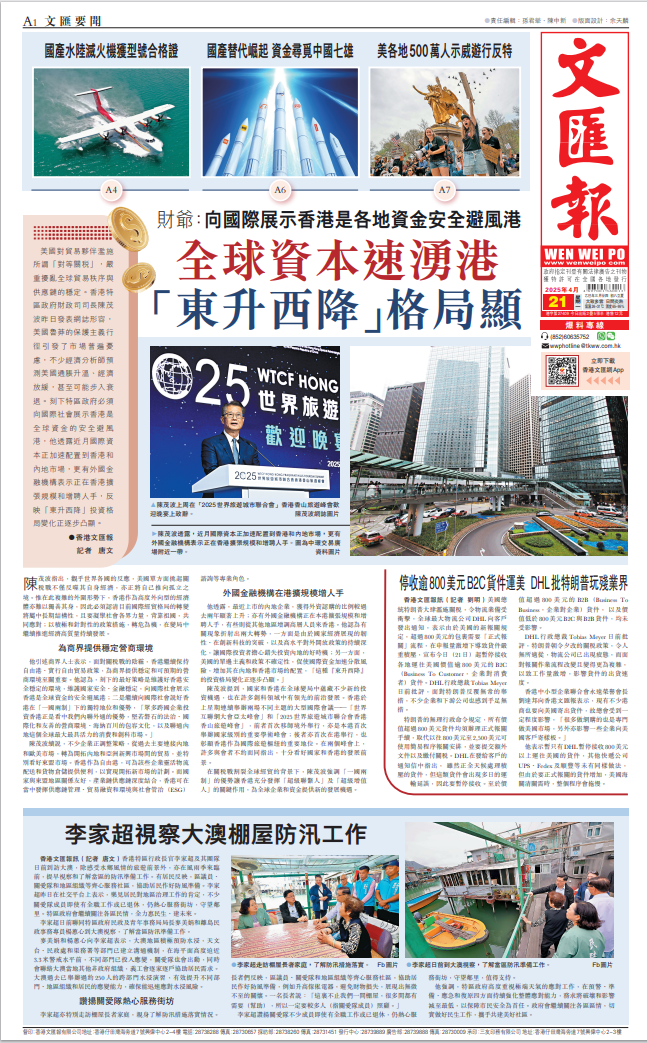 美國對貿易伙伴濫施所謂「對等關稅」,嚴重擾亂全球貿易秩序與供應鏈的穩定。香港特區政府財政司司長陳茂波昨日發表網志形容,美國魯莽的保護主義行徑引發了市場普遍憂慮,不少經濟分析師預測美國通脹升溫、經濟放緩,甚至可能步入衰退。刻下特區政府必須向國際社會展示香港是全球資金的安全避風港,他透露近月國際資本正加速配置到香港和內地市場,更有外國金融機構表示正在香港擴張規模和增聘人手,反映「東升西降」投資格局變化正逐步凸顯。 ●香港文匯報記者唐文