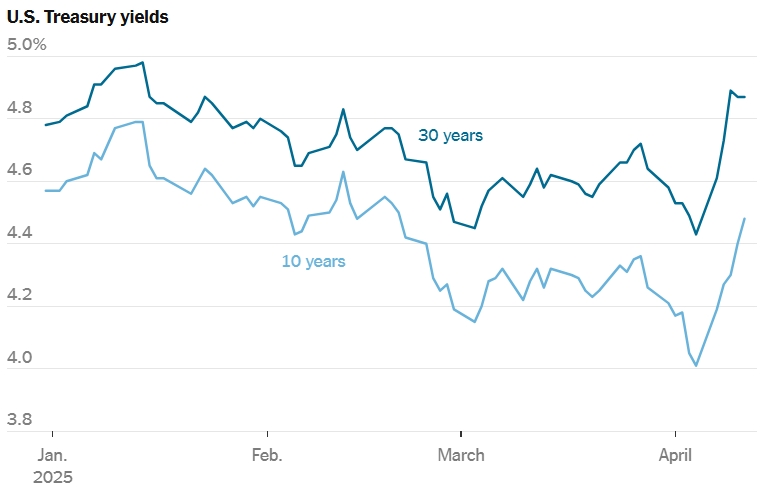 在上述報(bào)告發(fā)布之際,美國(guó)股市持續(xù)動(dòng)蕩。受美國(guó)總統(tǒng)特朗普所謂“對(duì)等關(guān)稅”政策沖擊,過(guò)去兩周,美國(guó)國(guó)債出現(xiàn)恐慌性拋售,30年期國(guó)債收益率一度上漲0.5個(gè)百分點(diǎn)。中美貿(mào)易緊張持續(xù),加劇了人們對(duì)中美“脫鉤”及全球經(jīng)濟(jì)日益惡化的擔(dān)憂。