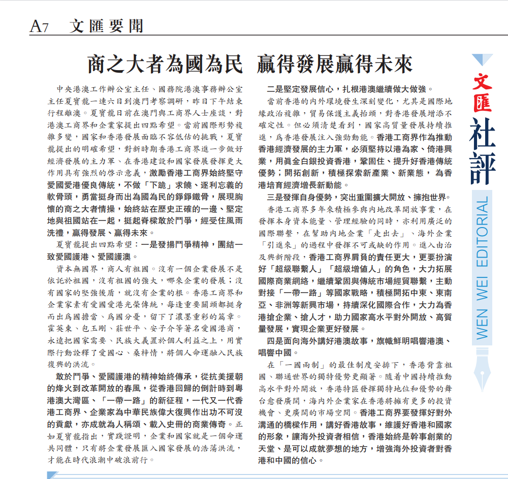中央港澳工作辦公室主任、國務(wù)院港澳事務(wù)辦公室主任夏寶龍一連六日到澳門考察調(diào)研,昨日下午結(jié)束行程離澳。夏寶龍日前在澳門與工商界人士座談,對港澳工商界和企業(yè)家提出四點希望。當(dāng)前國際形勢復(fù)雜多變,國家和香港發(fā)展面臨不容低估的挑戰(zhàn),夏寶龍?zhí)岢龅拿鞔_希望,對新時期香港工商界進一步做好經(jīng)濟發(fā)展的主力軍、在香港建設(shè)和國家發(fā)展發(fā)揮更大作用具有強烈的啟示意義,激勵香港工商界始終堅守愛國愛港優(yōu)良傳統(tǒng),不做「下跪」求饒、逐利忘義的軟骨頭,勇當(dāng)挺身而出為國為民的錚錚鐵骨,展現(xiàn)胸懷的商之大者情操,始終站在歷史正確的一邊、堅定地與祖國站在一起,挺起脊梁敢于斗爭,經(jīng)受住風(fēng)雨洗禮,贏得發(fā)展、贏得未來。