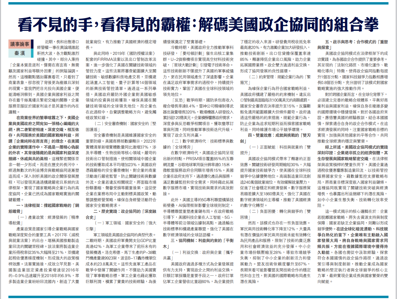 綜上所述,美國政企協(xié)同模式的實踐深刻印證:企業(yè)絕非孤立的經(jīng)濟(jì)個體,其生存發(fā)展與國家戰(zhàn)略緊密交織。在法律框架與政策杠桿的雙重作用下,美國企業(yè)通過稅收優(yōu)惠響應(yīng)制造業(yè)回流、以技術(shù)管控服務(wù)國家安全、借數(shù)據(jù)監(jiān)控支撐戰(zhàn)略布局,將商業(yè)目標(biāo)深度嵌入國家利益鏈條。這種協(xié)同既實現(xiàn)了關(guān)鍵技術(shù)突破與經(jīng)濟(jì)增長,也暴露出利益捆綁下的潛在風(fēng)險,如中小企業(yè)生態(tài)失衡、技術(shù)轉(zhuǎn)化效率受阻。