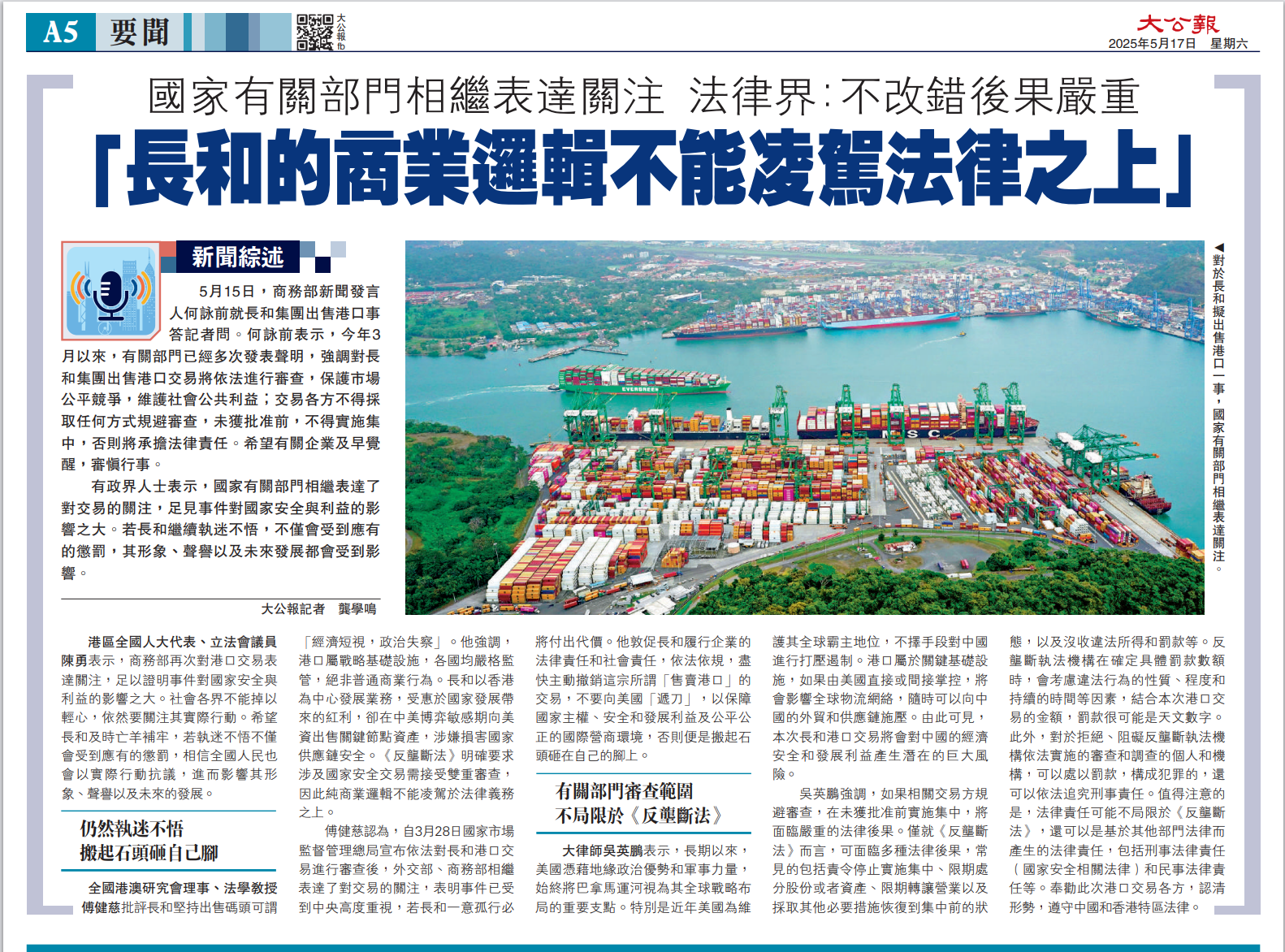 全國港澳研究會理事、法學(xué)教授傅健慈批評長和堅持出售碼頭可謂「經(jīng)濟(jì)短視,政治失察」。他強(qiáng)調(diào),港口屬戰(zhàn)略基礎(chǔ)設(shè)施,各國均嚴(yán)格監(jiān)管,絕非普通商業(yè)行為。長和以香港為中心發(fā)展業(yè)務(wù),受惠于國家發(fā)展帶來的紅利,卻在中美博弈敏感期向美資出售關(guān)鍵節(jié)點(diǎn)資產(chǎn),涉嫌損害國家供應(yīng)鏈安全。 《反壟斷法》明確要求涉及國家安全交易需接受雙重審查,因此純商業(yè)邏輯不能凌駕于法律義務(wù)之上。