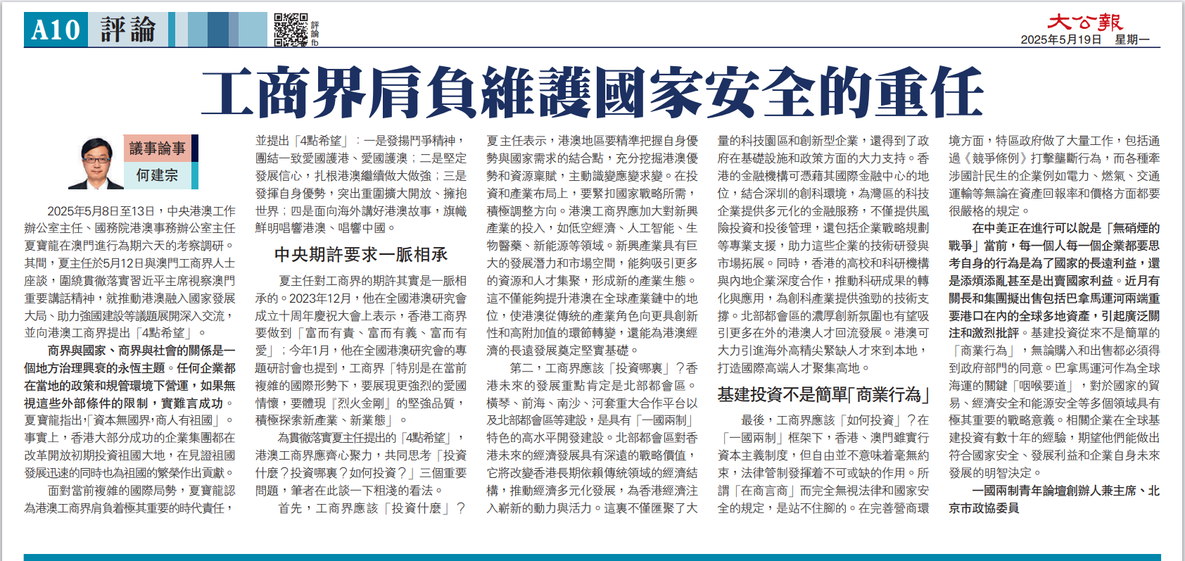 2025年5月8日至13日,中央港澳工作辦公室主任、國務(wù)院港澳事務(wù)辦公室主任夏寶龍在澳門進行為期六天的考察調(diào)研。其間,夏主任于5月12日與澳門工商界人士座談,圍繞貫徹落實習(xí)近平主席視察澳門重要講話精神,就推動港澳融入國家發(fā)展大局、助力強國建設(shè)等議題展開深入交流,并向港澳工商界提出「4點希望」。