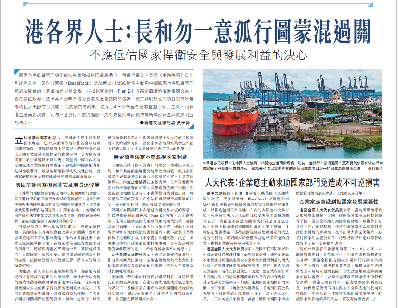 他強(qiáng)調(diào),若企業(yè)的行為損及國(guó)家利益,終將反噬其自身的長(zhǎng)期發(fā)展。在當(dāng)前國(guó)際地緣政治風(fēng)云變幻的背景下,香港企業(yè)在處理涉及跨國(guó)關(guān)鍵基礎(chǔ)設(shè)施的交易時(shí),應(yīng)以長(zhǎng)遠(yuǎn)眼光,謹(jǐn)慎考量國(guó)際政治因素,尤須優(yōu)先保障國(guó)家安全。