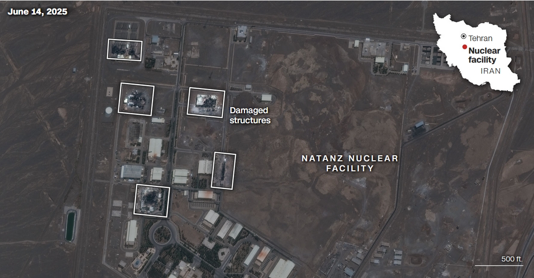 美國有線電視新聞網(CNN)15日報道,以色列此次空襲針對的是伊朗中北部三地——納坦茲(Natanz)、伊斯法罕(Isfahan)和福爾道(Fordow)的三個關鍵核設施。最新商業衛星圖像顯示,至少在納坦茲和伊斯法罕,攻擊似乎已對地面設施造成了“重大破壞”。