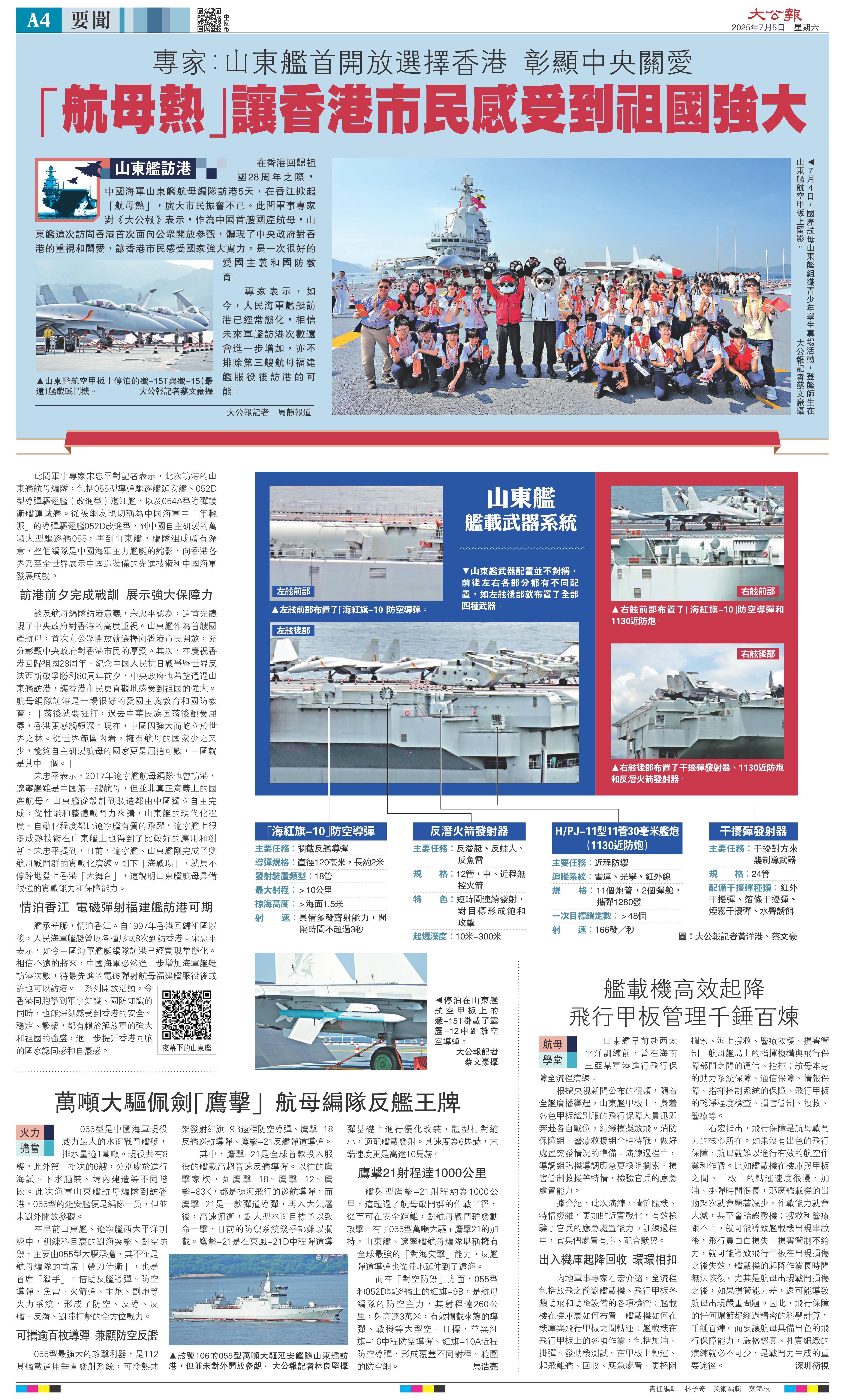 在香港回歸祖國28周年之際,中國海軍山東艦航母編隊訪港5天,在香江掀起「航母熱」,廣大市民振奮不已。此間軍事專家對《大公報》表示,作為中國首艘國產航母,山東艦這次訪問香港首次面向公眾開放參觀,體現了中央政府對香港的重視和關愛,讓香港市民感受國家強大實力,是一次很好的愛國主義和國防教育。